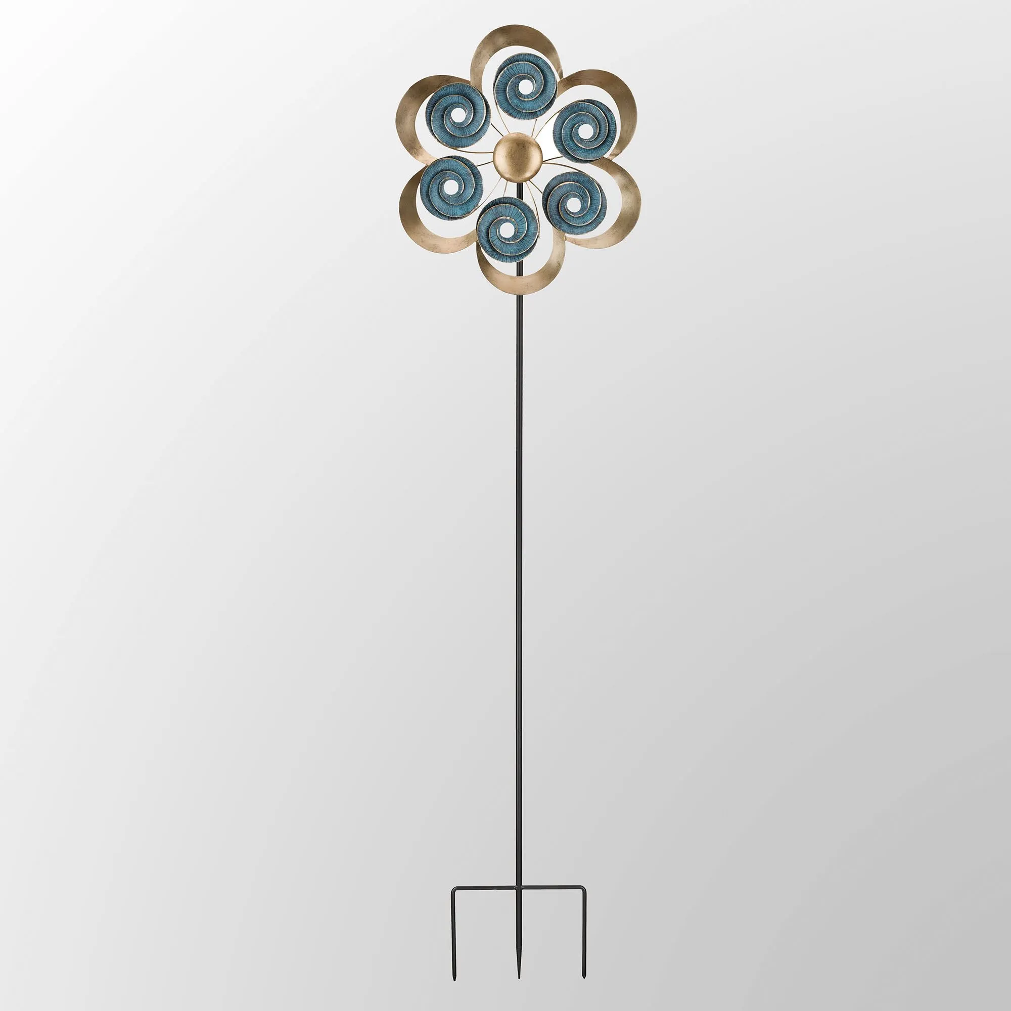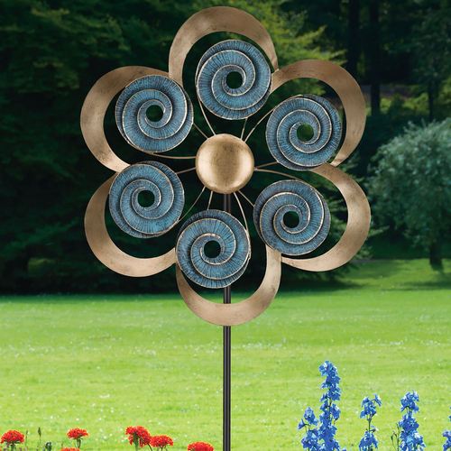 Watch the Hypnotic Gaze Wind Spinner swirl and whirl as it catches the breeze. This metal wind spinner has a powder-coat finish in aged gold, gray, and a blue wash and features two sets of blades that rotate in opposite directions. A sturdy three-pronged fork at the base secures the spinner to the ground. For outdoor year-round use. Measures 19"Wx6"Dx70"H.