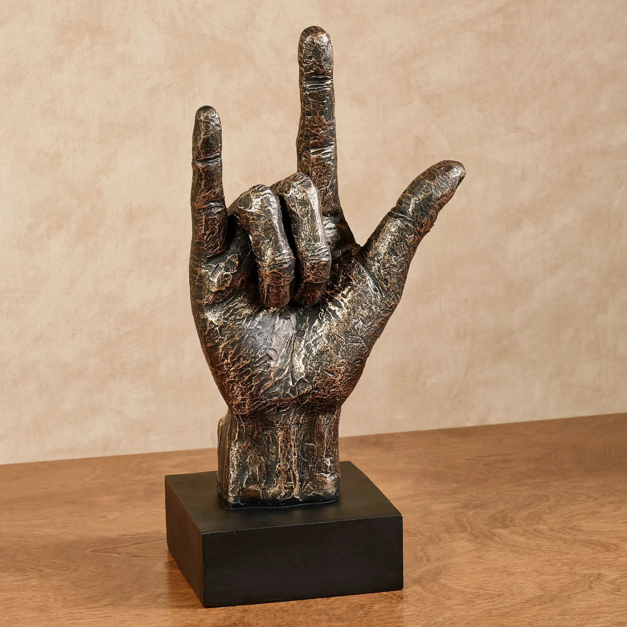 Show your sweetest feelings with the I Love You Table Sculpture, a touching way to depict that most beautiful of sentiments. Resin sculpture depicts a hand forming the sign for "love" and is finished in bronze with gold highlights. The square wooden base is solid black. Love sign sculpture measures 8.5"Wx6"Dx16"H.