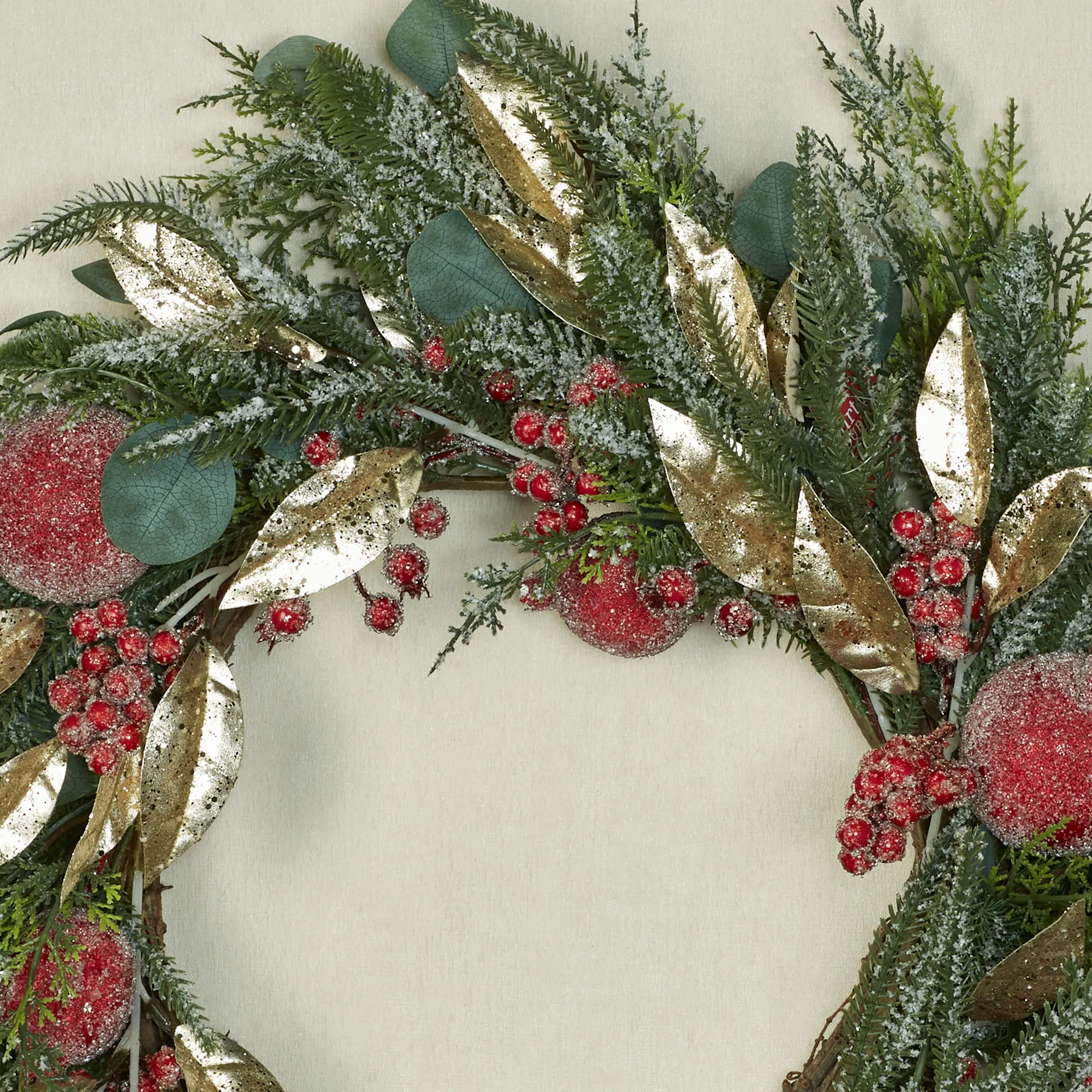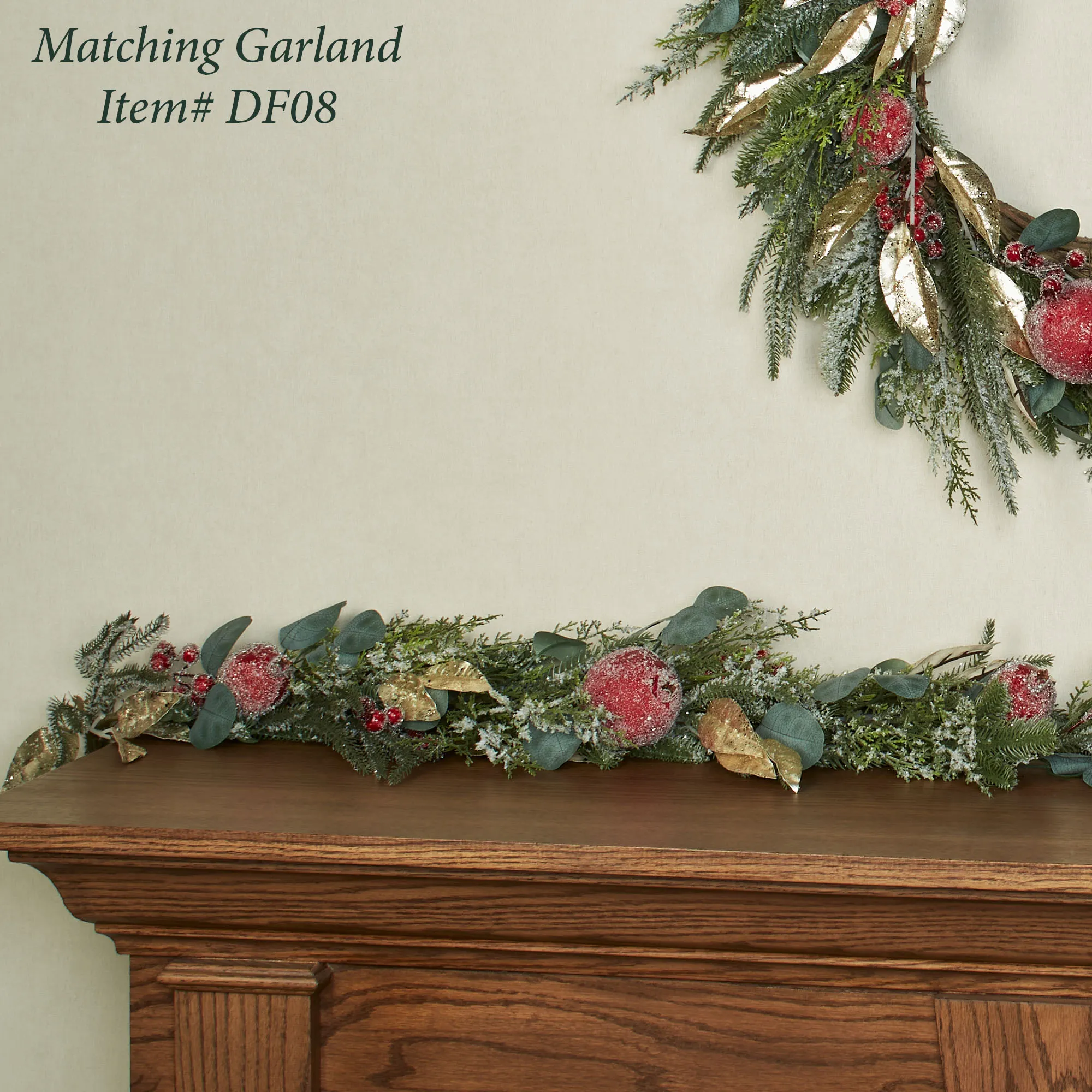 Evoke a fresh burst of winter charm with the Iced Holiday Wreath. With a natural grapevine base, the faux greenery wreath features snowy green pine boughs, eucalyptus leaves, gold foliage, red pomegranates, and berries. The pomegranates and berries are adorned with faux ice. The gold leaves have shimmering glitter. This item will need to be fluffed upon arrival. Indoor use only. Measures approx. 26"dia.x6"D.