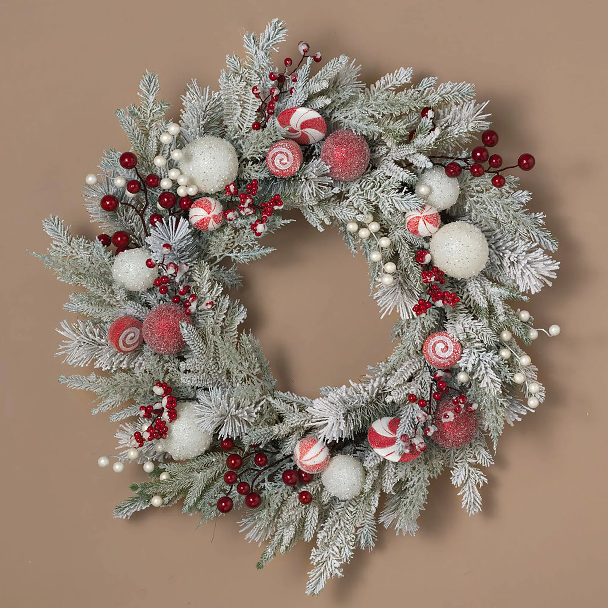 The Iced Peppermint Wreath decorates for the Christmas holiday in a classic way. This seasonal faux pine wreath has a red and white assortment of glittery faux peppermint candies, berries, and textured icy ornaments on an angel vine base. The faux pine greenery has flocked and icy glitter finishes. For indoor use only. This item may need to be fluffed after removing from the box. Measures approx. 28"dia.x7"D.