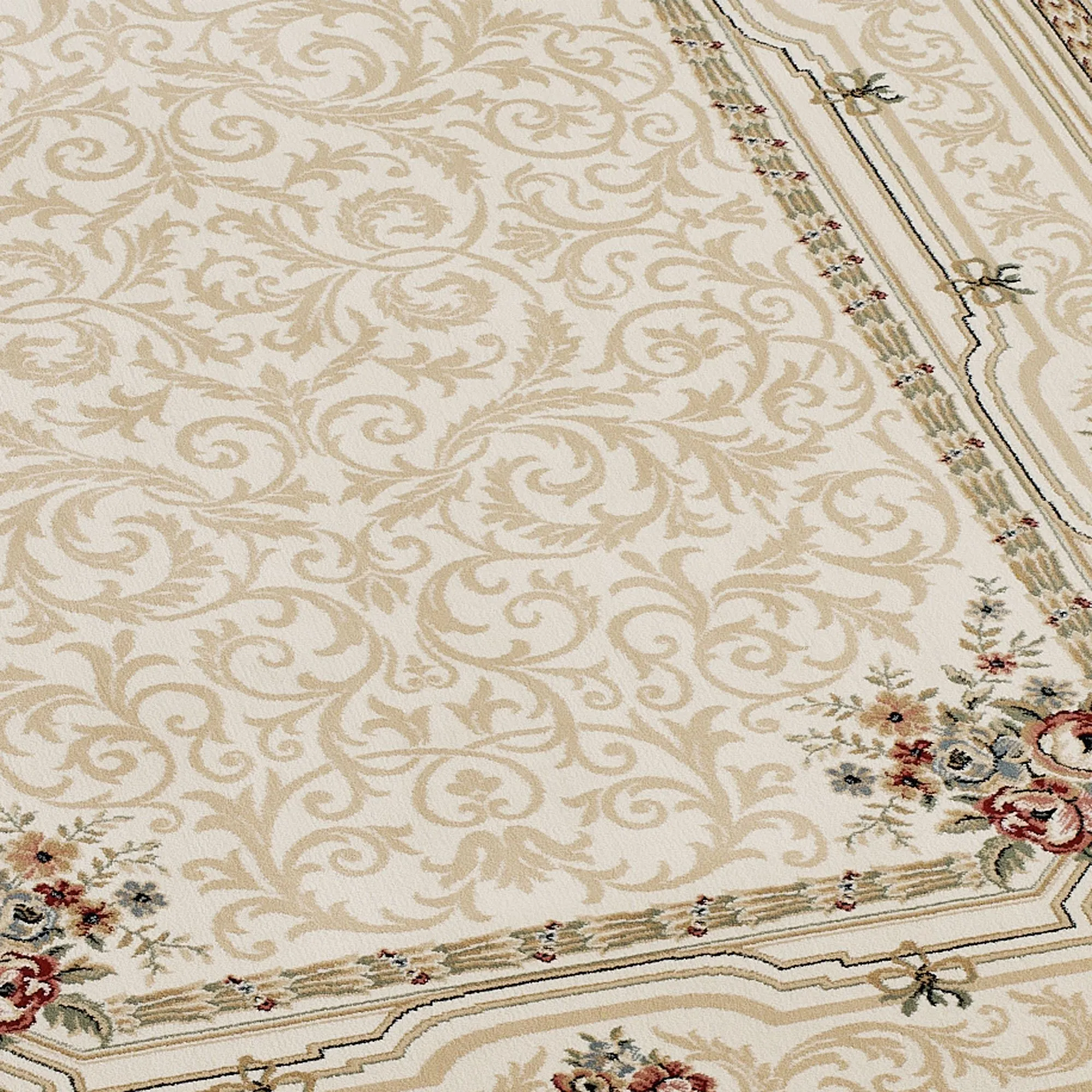 Sweet floral blossoms, acanthus leaves, and ornate medallions create the beautiful designs displayed on the Imogene Garden Area Rugs. These fine heat-set polypropylene area rugs, .5" thick, are machine-woven and feature scrolling motifs. The ivory coloration has an ivory field with gold, ivory, black, blue, and burgundy. We recommend professional cleaning by a rug cleaner. Made in Belgium.