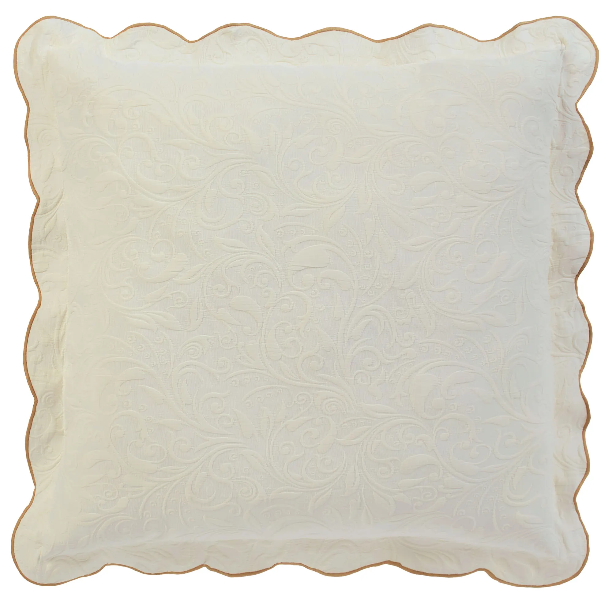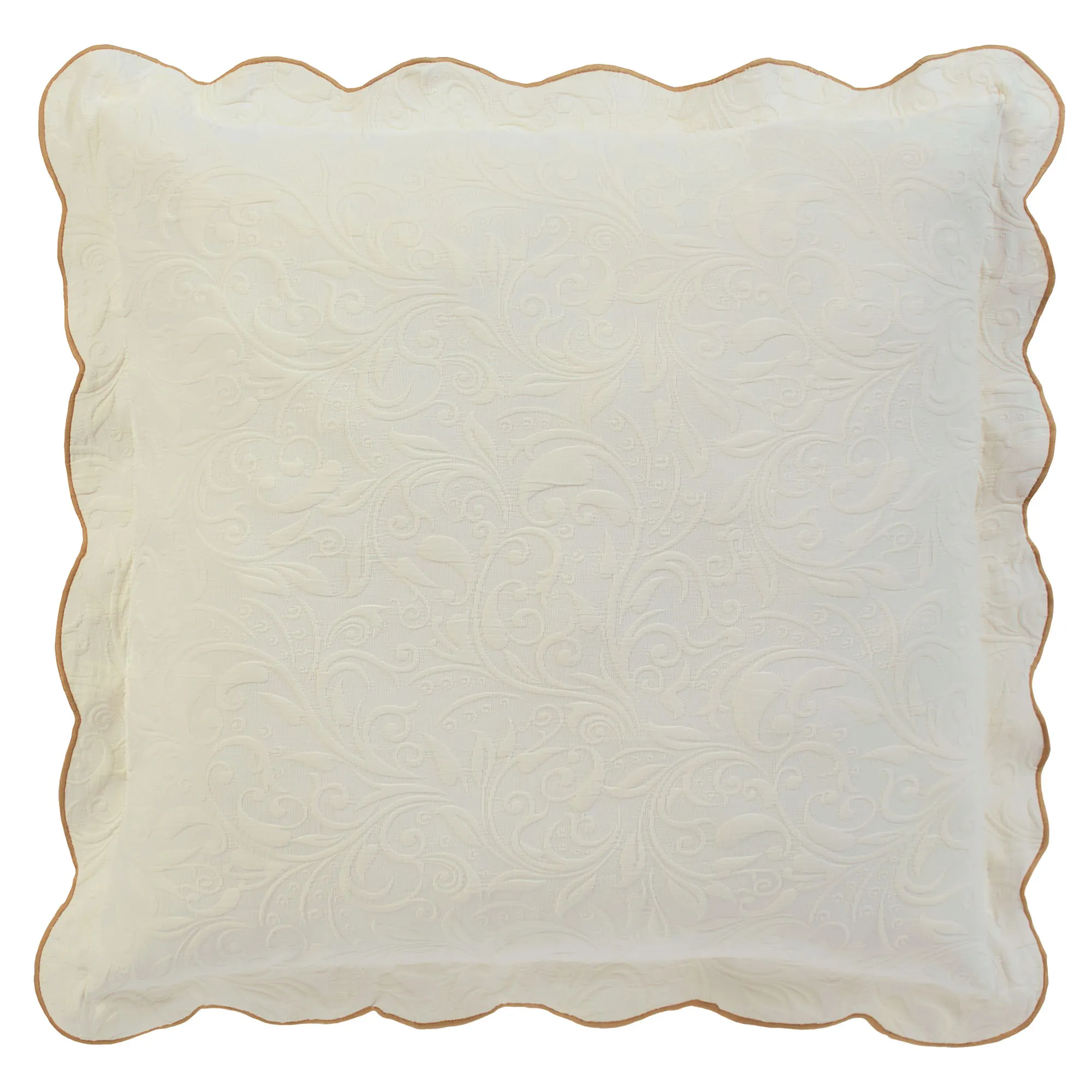 The European Sham has a scalloped flange with soft gold stitching, matelasse scrolls, and a French back closure.
