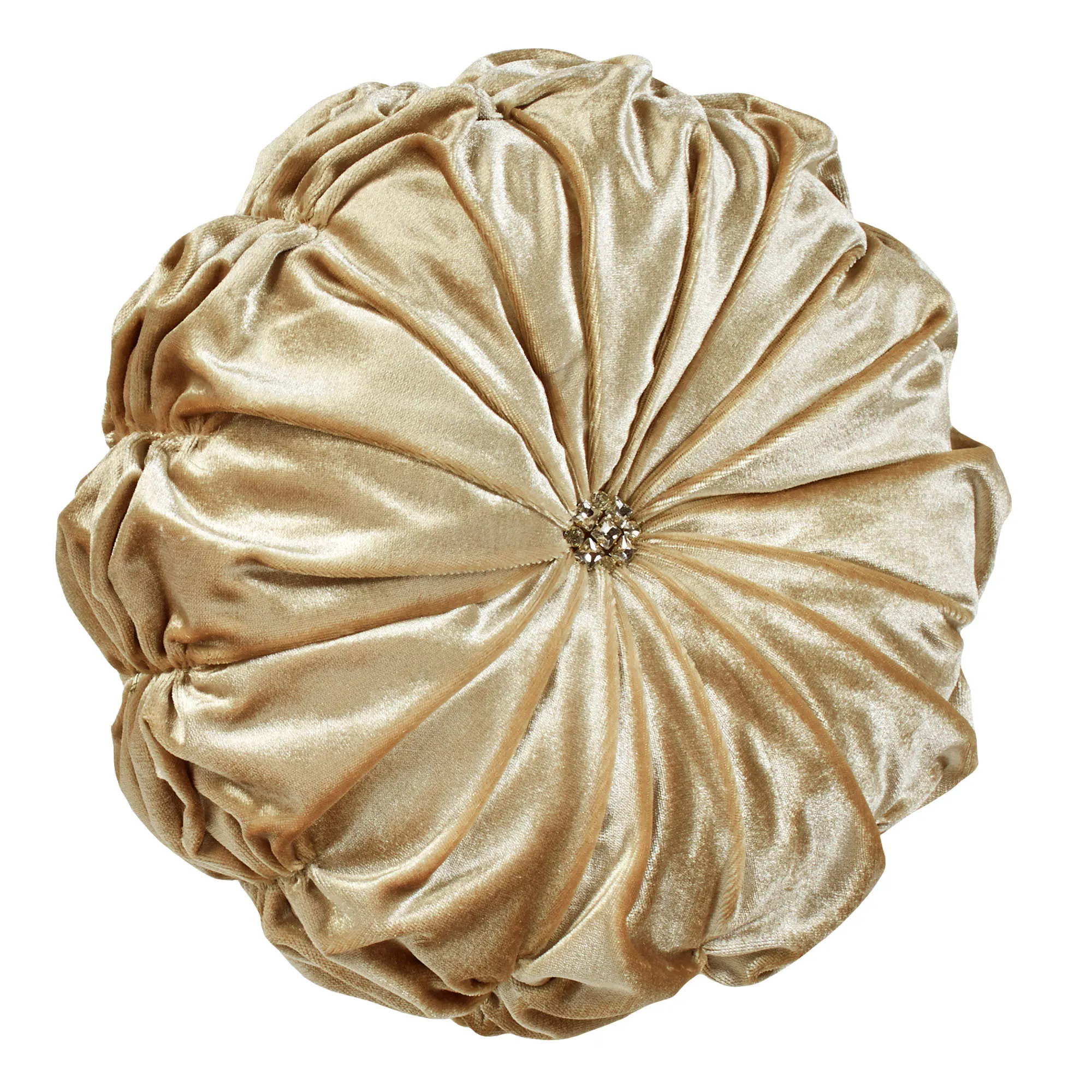 Pillows: Spot clean. Square has velvet appliqued soft gold medallion motifs with embroidery, matelasse scrolls, and a scalloped flange with soft gold stitching. Round is soft gold velvet and has a button tuft with an acrylic jewel.