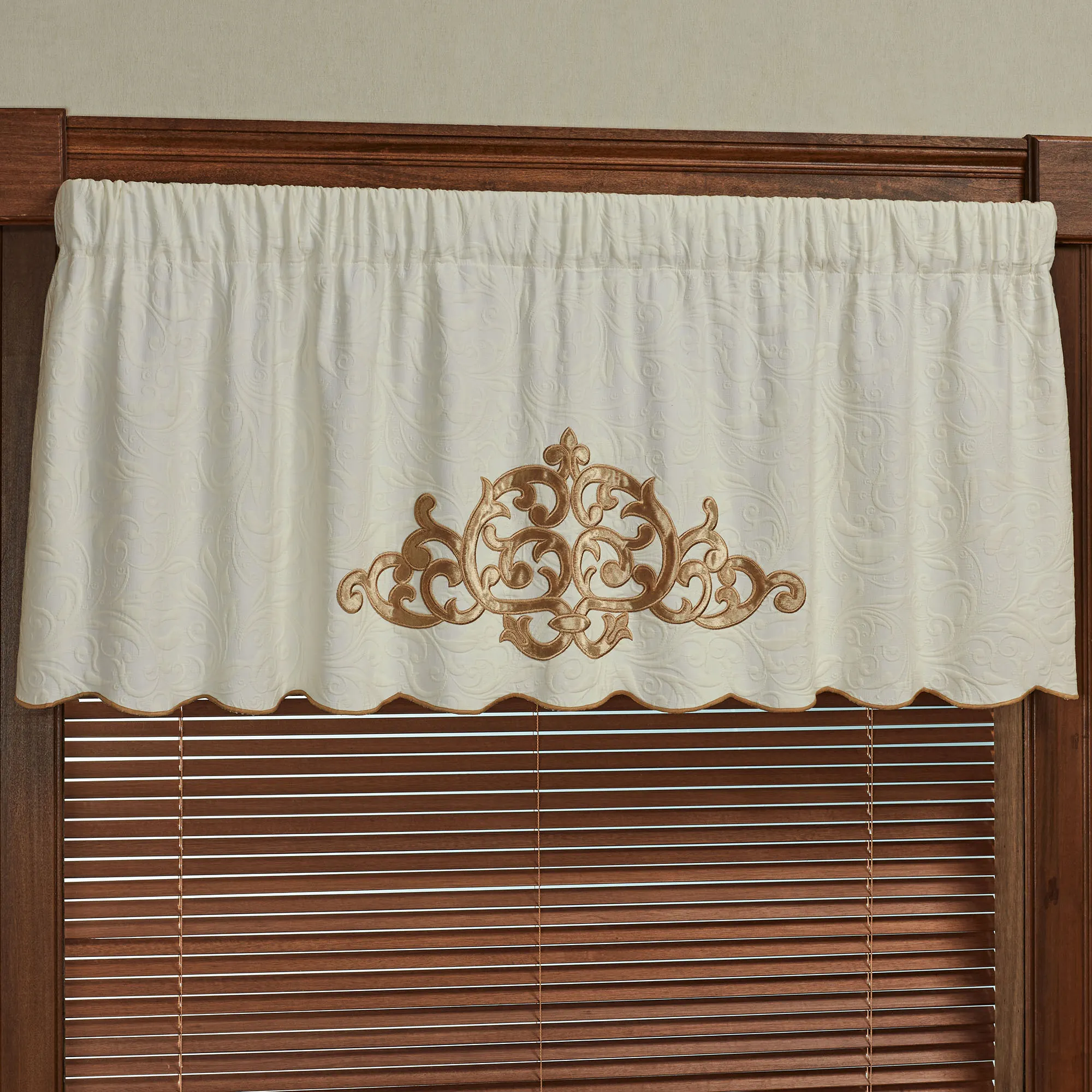 Valance has a velvet applique with embroidery, scalloped ends with soft gold stitching, matelase scrolls, and a 3" rod pocket.