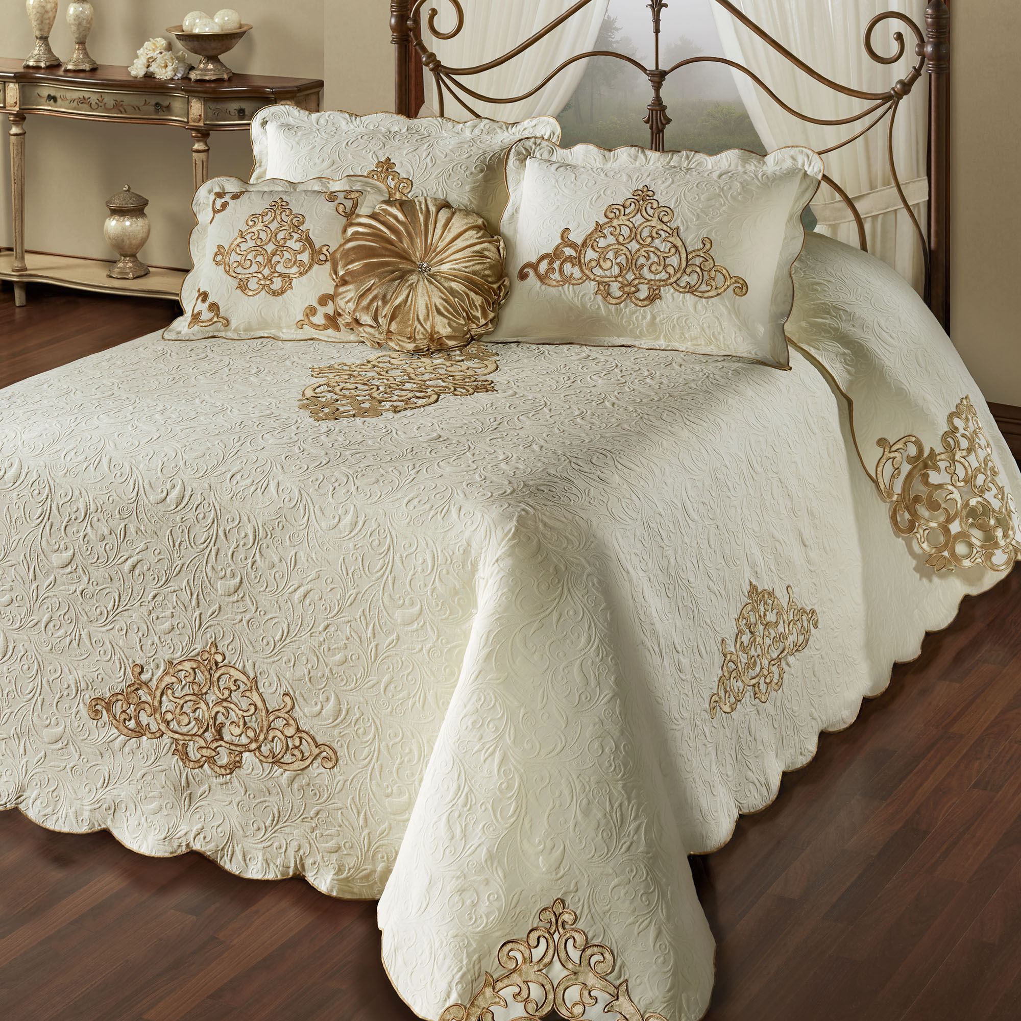 The Bedspread Set includes a grande bedspread and two shams. The lightweight, ivory bedspread has velvet applique medallions with embroidery, matelasse scrolls, contour-cut front corners, a 24" drop, a reverse pillow tuck to cover your pillows neatly, and scalloped ends with soft gold stitching. Scalloped shams have matelasse scrolls, a velvet applique medallion design with embroidery, soft gold stitching, and French back closures. For bedspread set, choose Grande Queen, Grande King, or Grande Cal King.