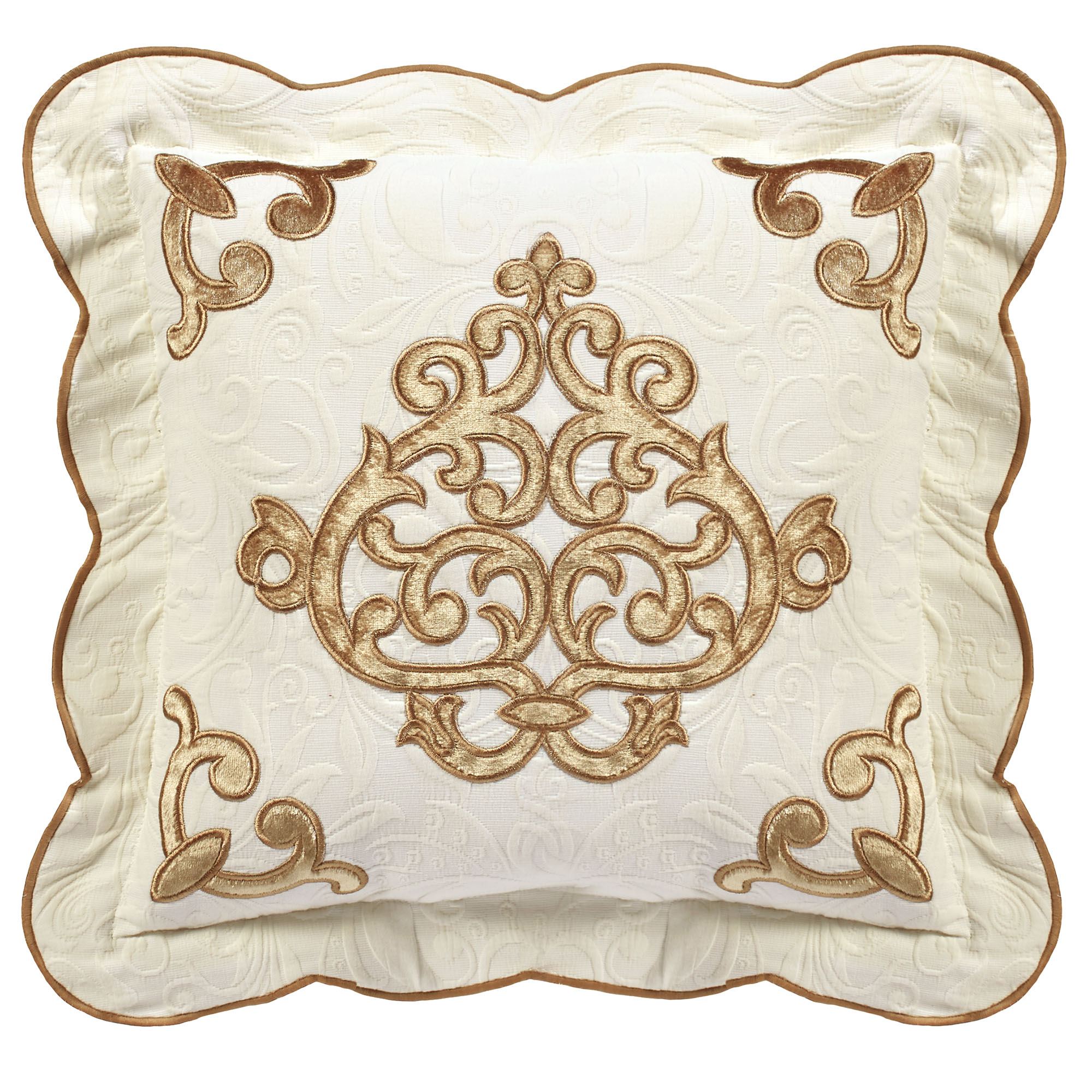 The European Sham has a scalloped flange with soft gold stitching, matelasse scrolls, and a French back closure.