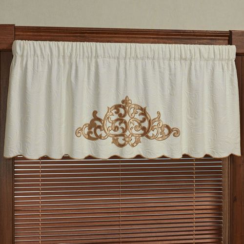 Upscale with a modern flair, the Imperial Scalloped Valance elegantly defines pure luxury. This ivory, cotton/polyester, woven matelasse valance is beautifully embellished with classic scroll designs and a velvet appliqued soft gold scroll medallion design with embroidery. Valance has scalloped ends with soft gold stitching and a 3" rod pocket. Measures 60"Wx18"L. Machine washable. Imported.