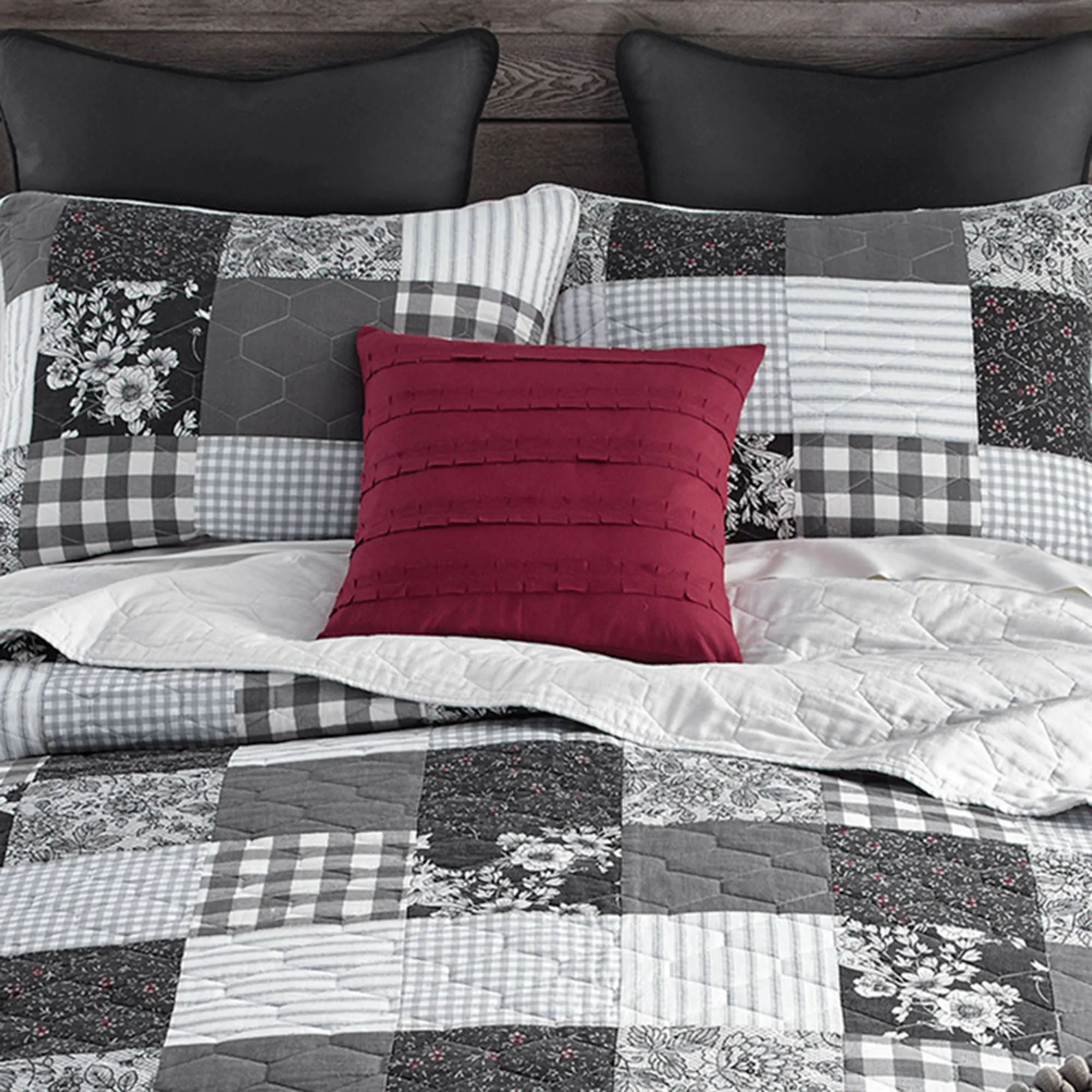 Dream of nostalgic days spent among an Indiana Farmhouse. From Donna Sharp(R), the cotton bedding features a classic patchwork array of floral, solid, striped, and plaid blocks. A palette of gray, charcoal, black, red, and white hues adds to the sentimental flair. Hexagonal quilting and bound edges finish all, except the Pillow.