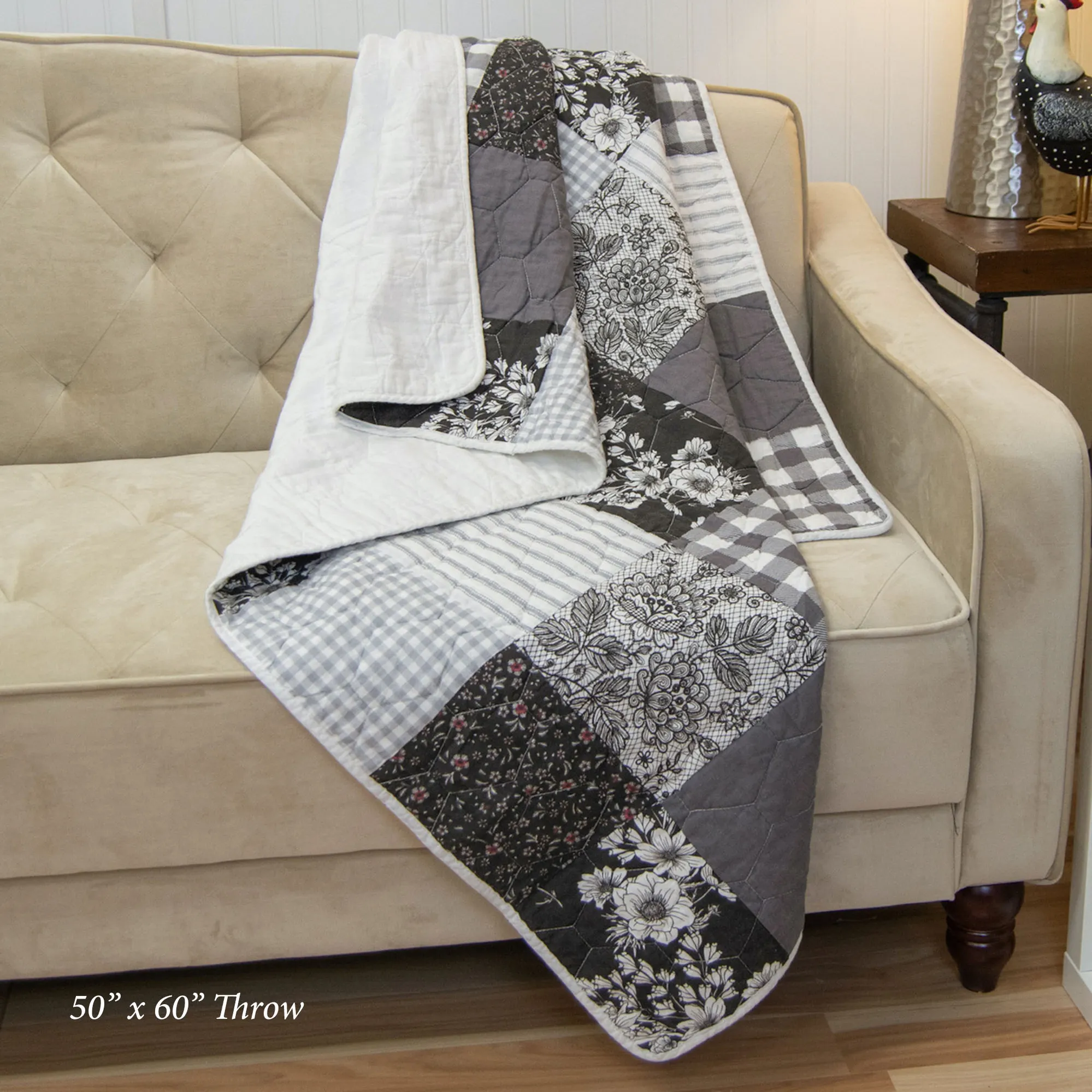 Dream of nostalgic days with the Indiana Farmhouse Patchwork Bedding from Donna Sharp(R). The Mini Quilt Set includes a quilt and shams. The cotton quilt features a classic patchwork array of floral, solid, striped, and plaid blocks in gray, charcoal, black, red, and white. Quilt also has hexagonal quilting and is backed in solid white. Fill is a cotton/polyester blend. Machine washable. Imported. Sorry, the solid gray throw shown on the bed is not available.