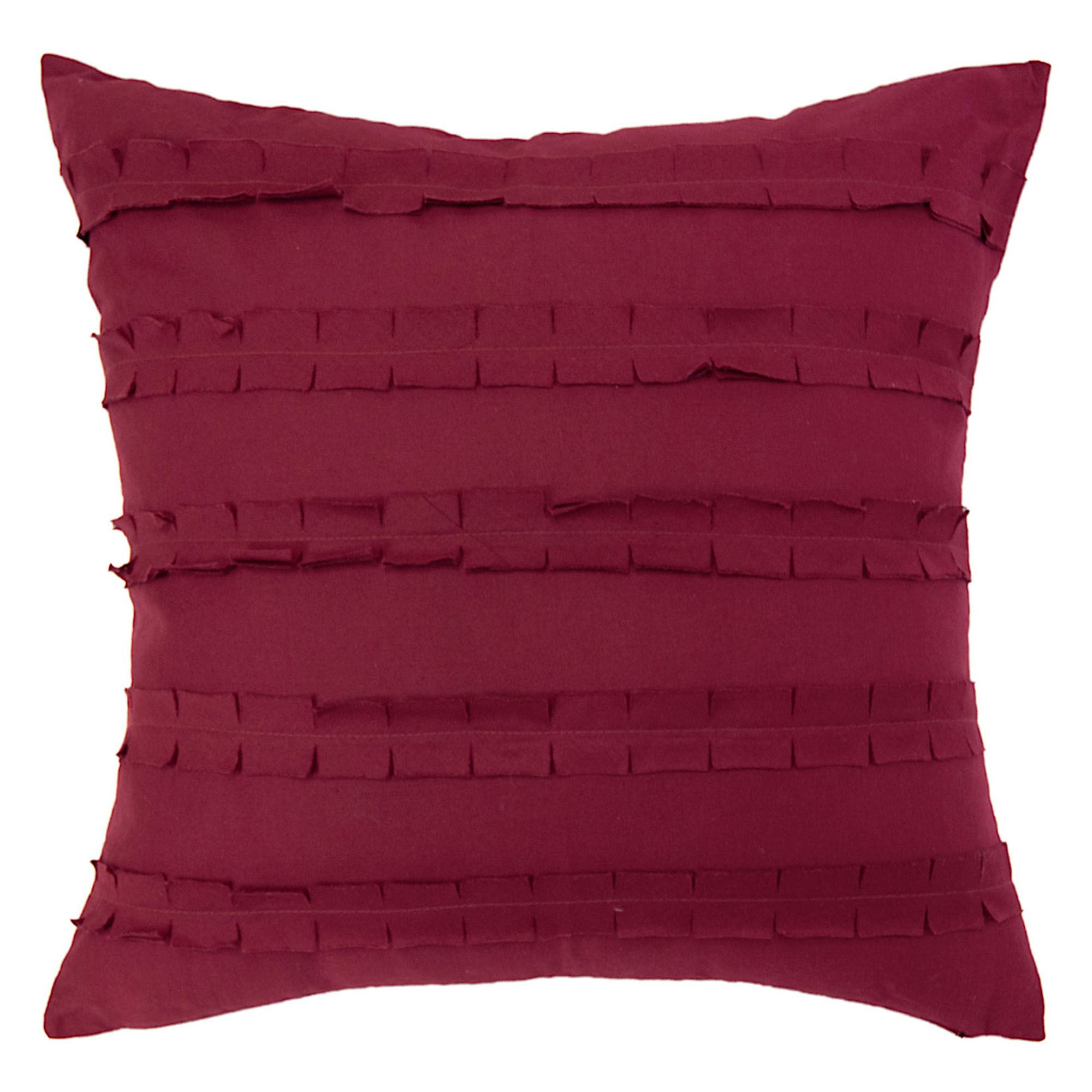 Square Pillow is red with attached accent ruffles and tailored edges; zipper closure. Spot clean the insert.