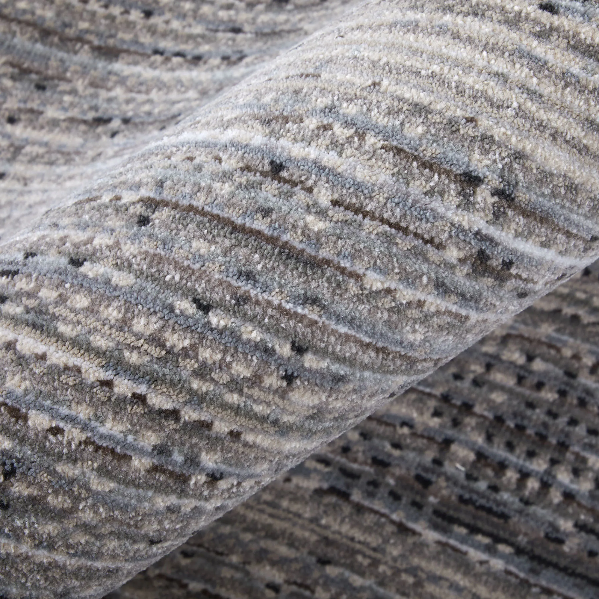 The Ingrid Gray Rug showcases a modern look and a variegated stripe design. The power-loomed, polypropylene/polyester/viscose area rug, .47" thick, has a low pile that is stain-resistant and kid- and pet-friendly. The gray coloration includes colors of black, gray, ivory, and light blue. Backing is latex. We recommend professional cleaning by a rug cleaner. Imported.