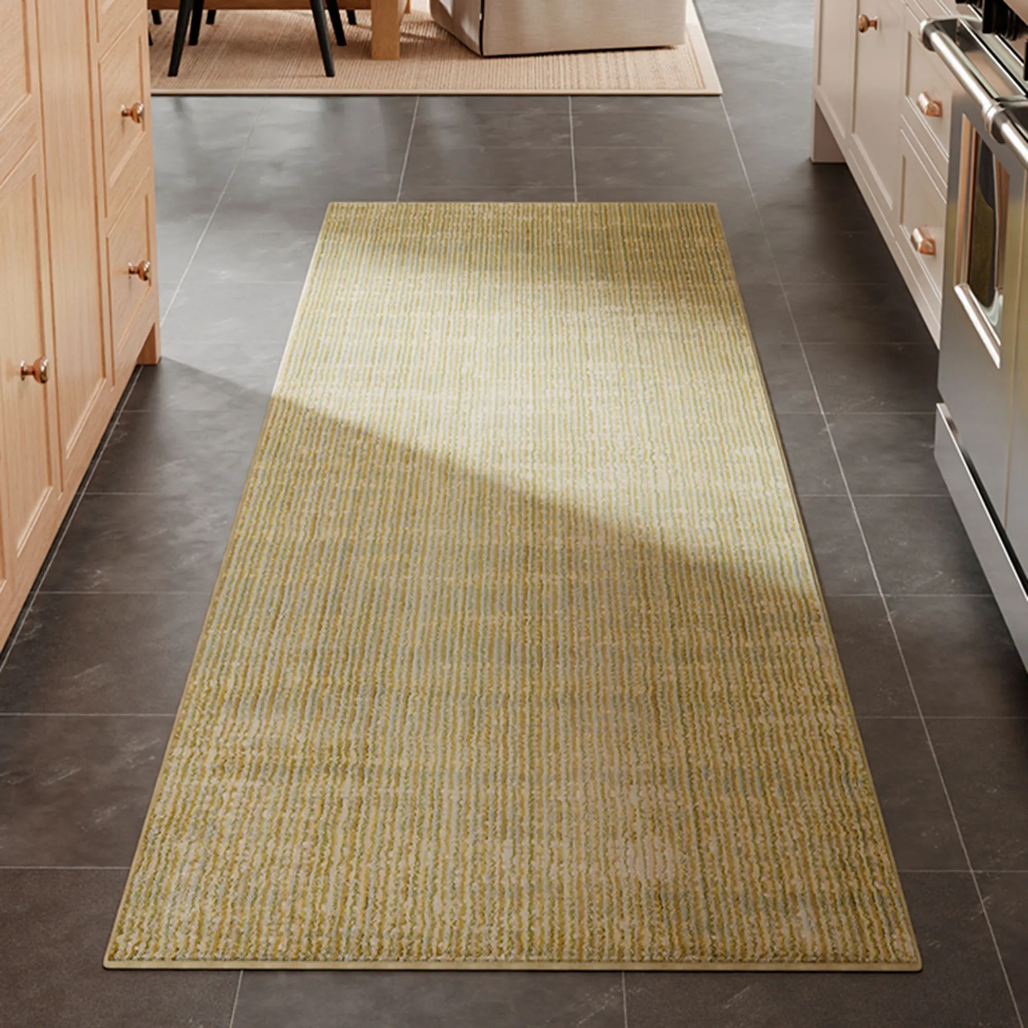 The Ingrid Sage Rug showcases a modern look and a variegated stripe design. The power-loomed, polypropylene/polyester/viscose area rug, .47" thick, has a low pile that is stain-resistant and kid- and pet-friendly. The sage coloration includes shades of sage, green, ivory, tan, gold, and hints of blue and gray. Backing is latex. We recommend professional cleaning by a rug cleaner. Imported.
