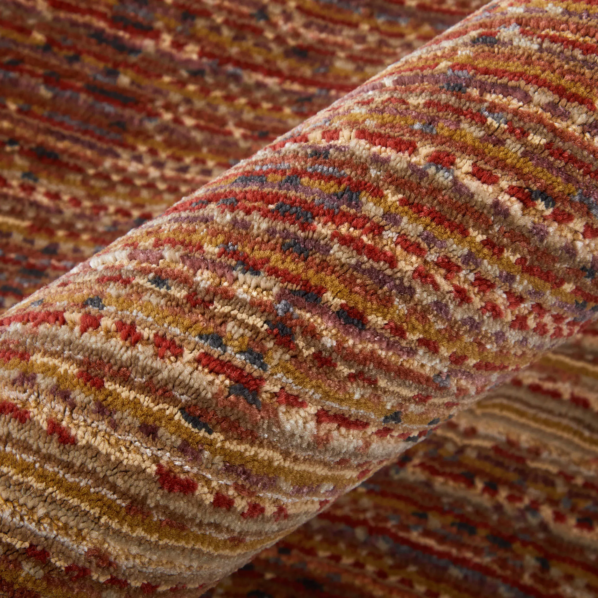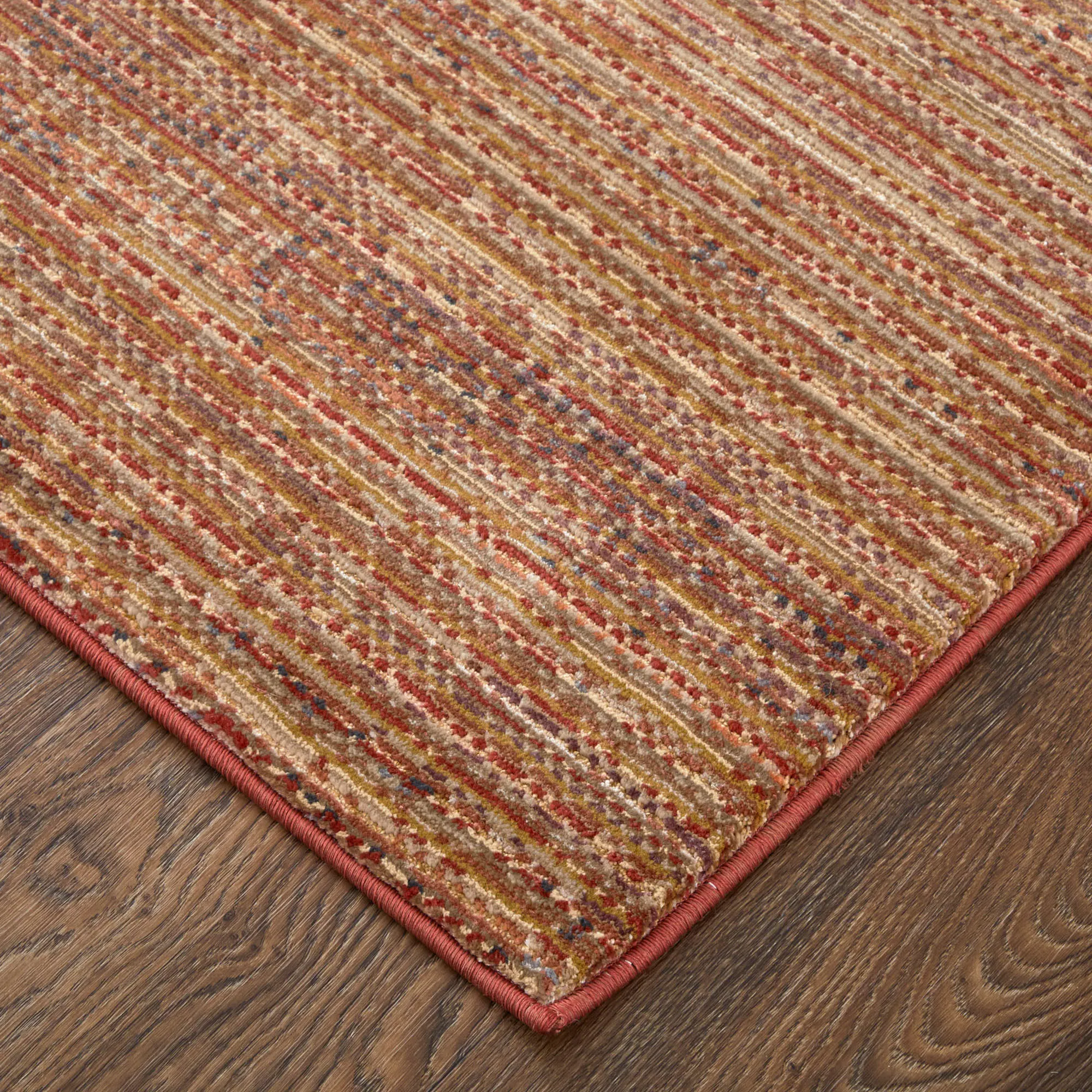 The Ingrid Terra Cotta Rug showcases a modern look and a variegated stripe design. The power-loomed, polypropylene/polyester/viscose area rug, .47" thick, has a low pile that is stain-resistant and kid- and pet-friendly. The terra cotta coloration includes colors of burgundy, gold, red, terra cotta, brown, and hints of blue. Backing is latex. We recommend professional cleaning by a rug cleaner. Imported.
