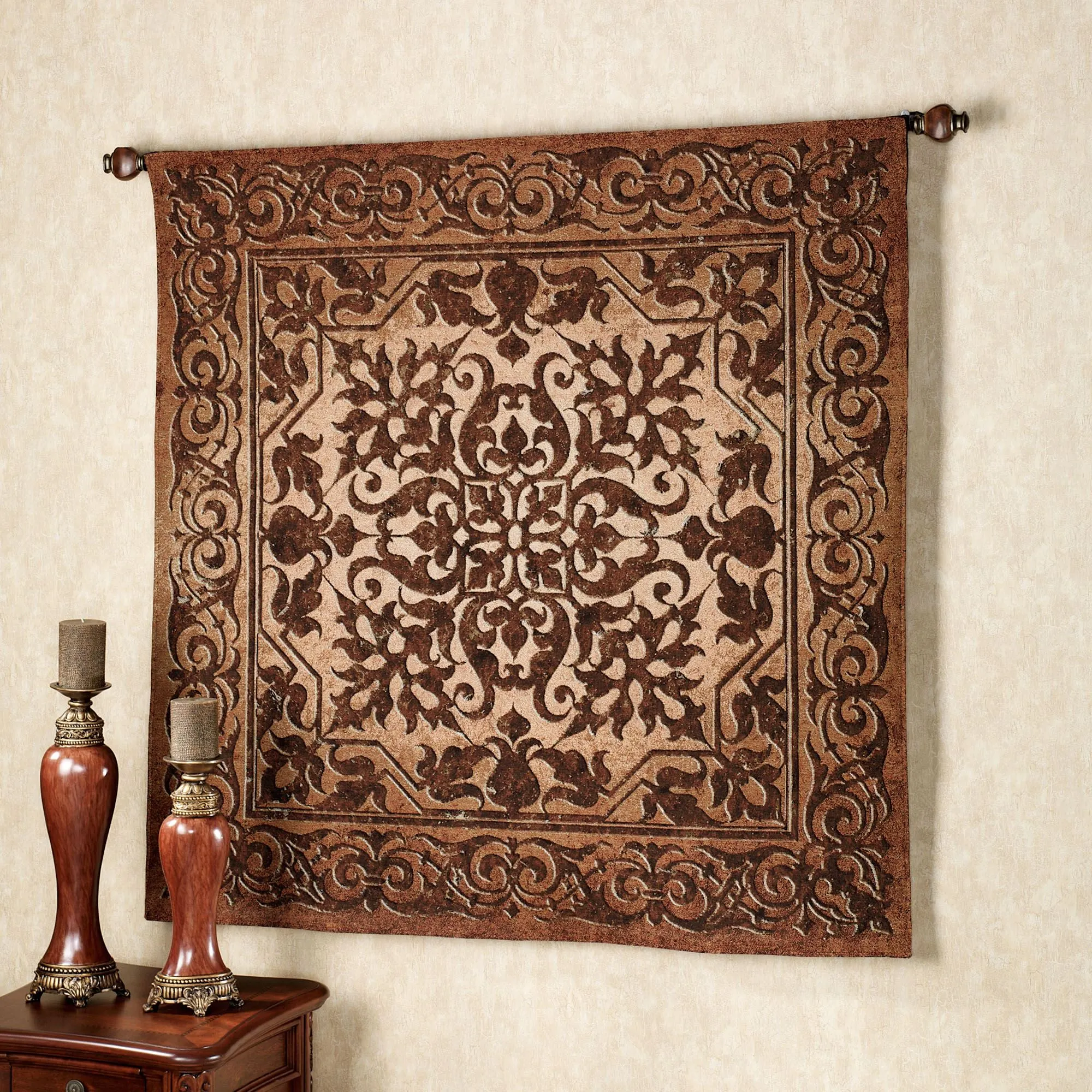 The exquisite Ironwork Wall Tapestry is detailed with romantic scrolls and fleurs in deep bronze on a burnt amber background. Jacquard-woven, cotton art is presented by Pure Country. Hang flush on the wall with the included brass tacks or use the 3" rod pocket with your rod for a traditional look. 53" sq. Dry clean.