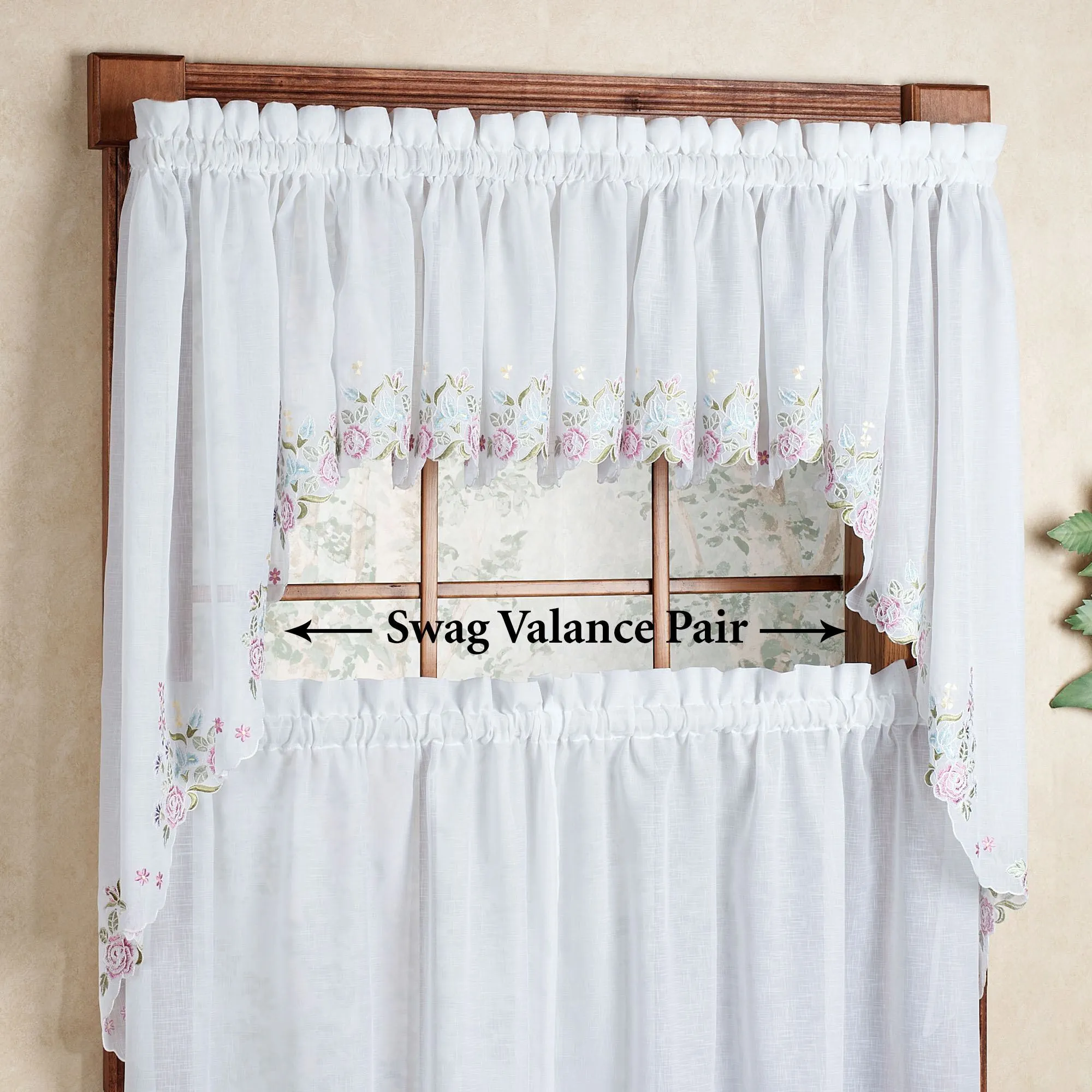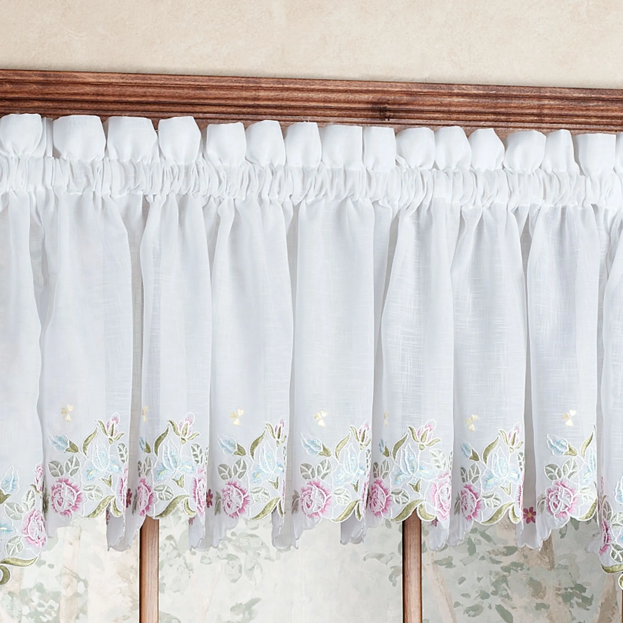 With a simple, delicate look, the Isabella Embroidered Semi-Sheer Tier Window Treatment is perfect for a kitchen, dining area, or bathroom. Semi-sheer polyester window treatment features beautiful, scalloped edging with embroidered roses and leaves. Specify Tier Pair, Swag Valance Pair, or Tailored Valance. Window treatment has 1.5" rod pockets. Machine wash. Imported.