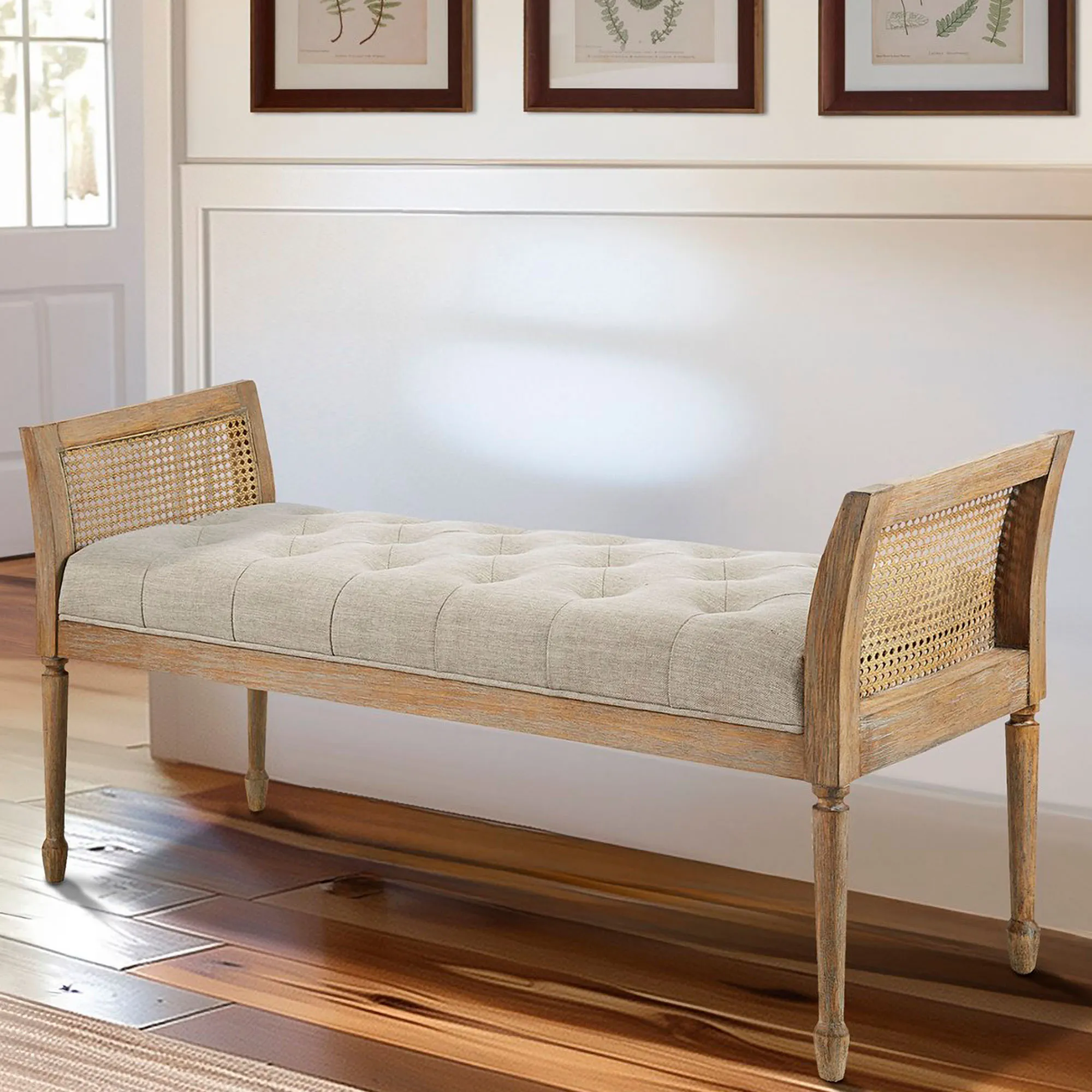 Complement a variety of spaces with the neutral hues and elegant design of the Isla Upholstered Accent Bench. Designed by Martha Stewart, the charming wood bench features a reclaimed natural finish, turned legs, cane inset sides, and a tufted ivory polyester upholstered seat with a high-density foam fill. Seat height is 18". Maximum weight is 400 lbs. Overall, the bench measures 48.5"Wx18"Dx24"H and weighs approx. 30 lbs. Spot clean the cushion.