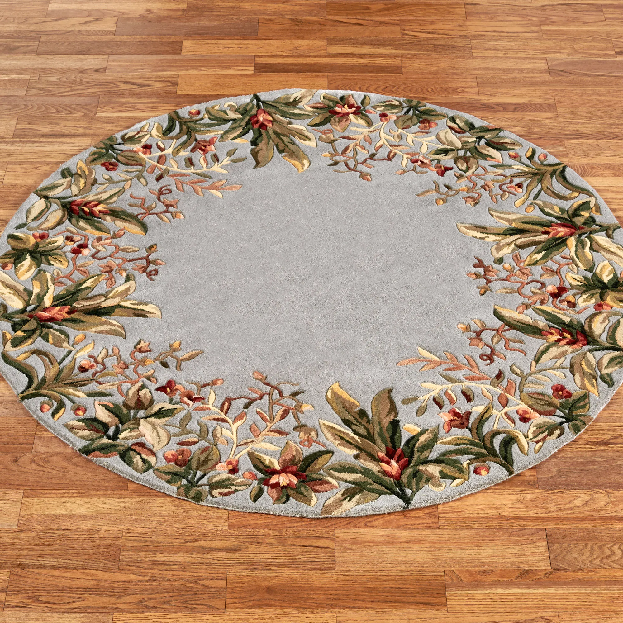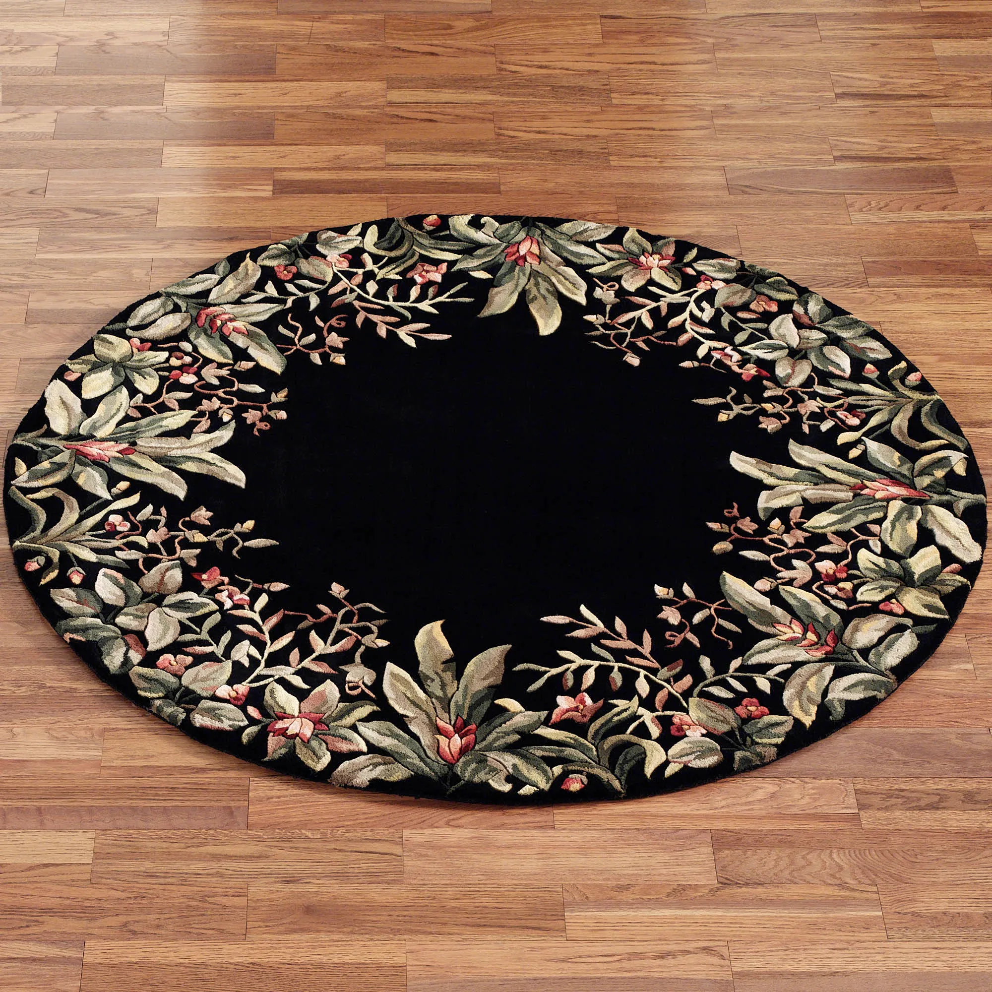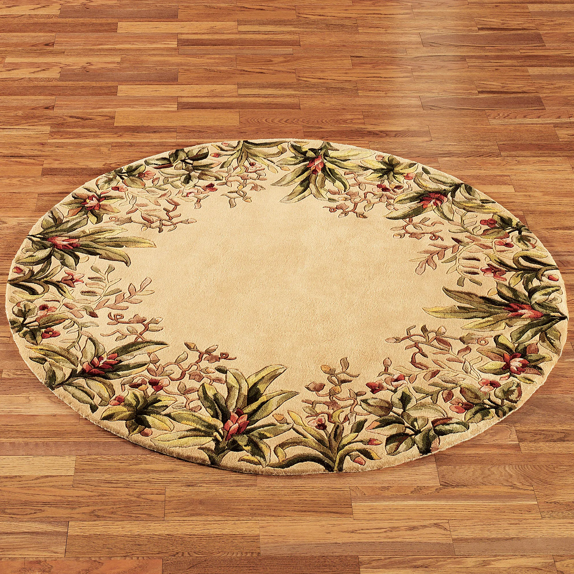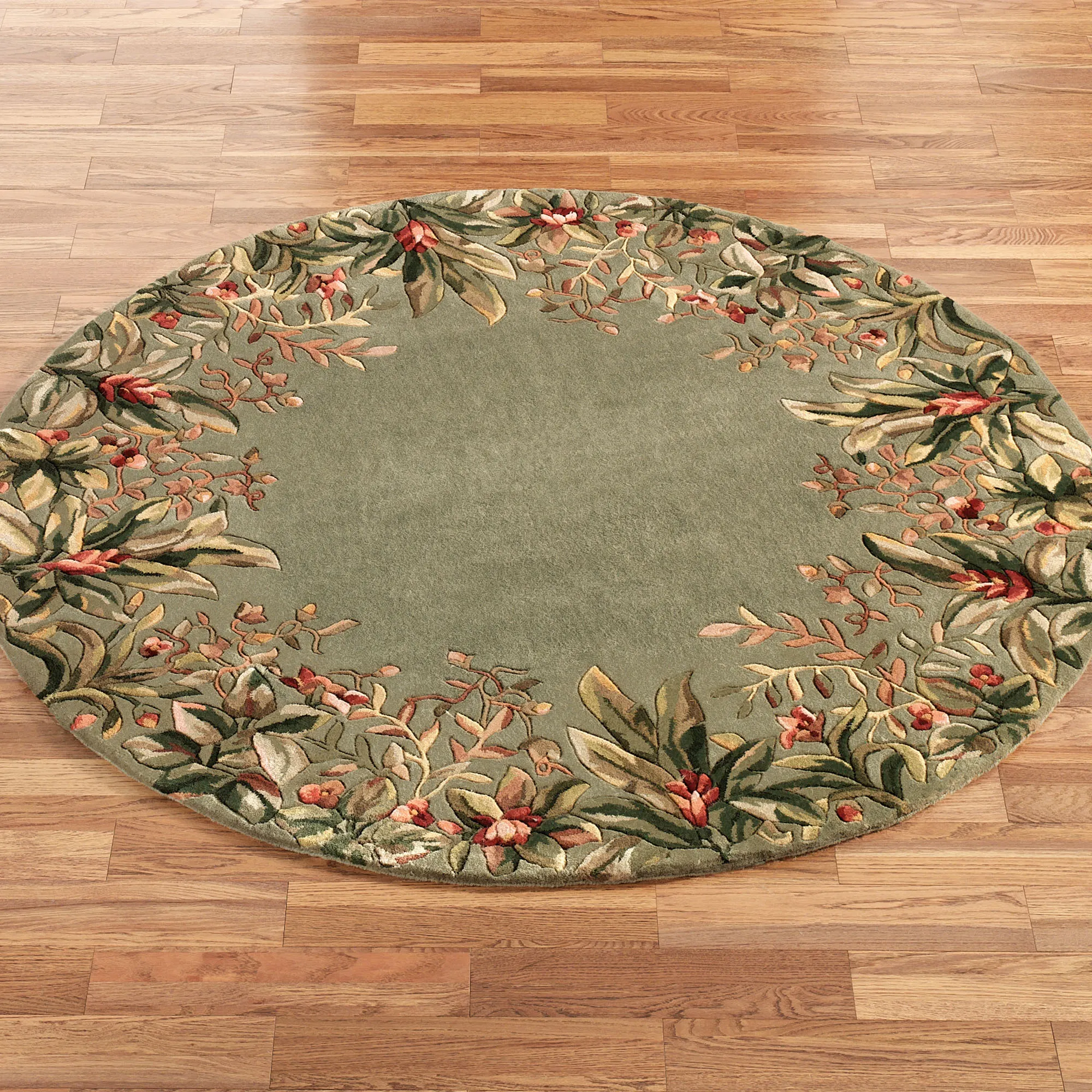The lush foliage of the tropics is taking over on the Island Flora Round Area Rugs. Solid fields are decorated from every angle with vibrantly colored exotic plants. Handcarving adds dimension to the florals and foliage of these plush, .5" thick, hand-tufted wool rugs. Accent colors include shades of green, red, and brown. Backing is cloth-covered latex. We recommend professional cleaning by a rug cleaner. Imported.