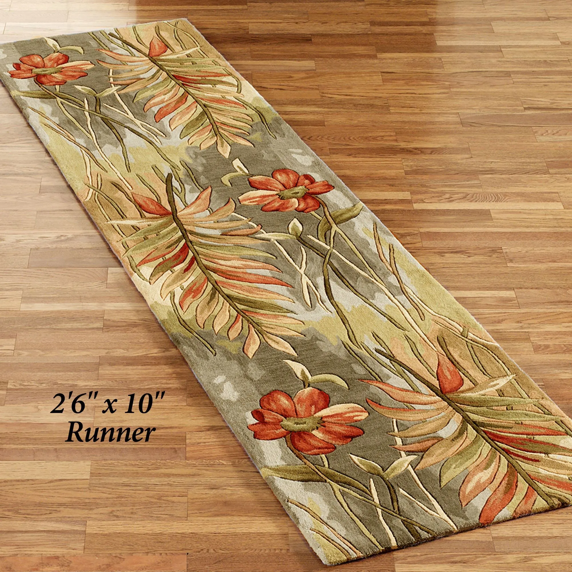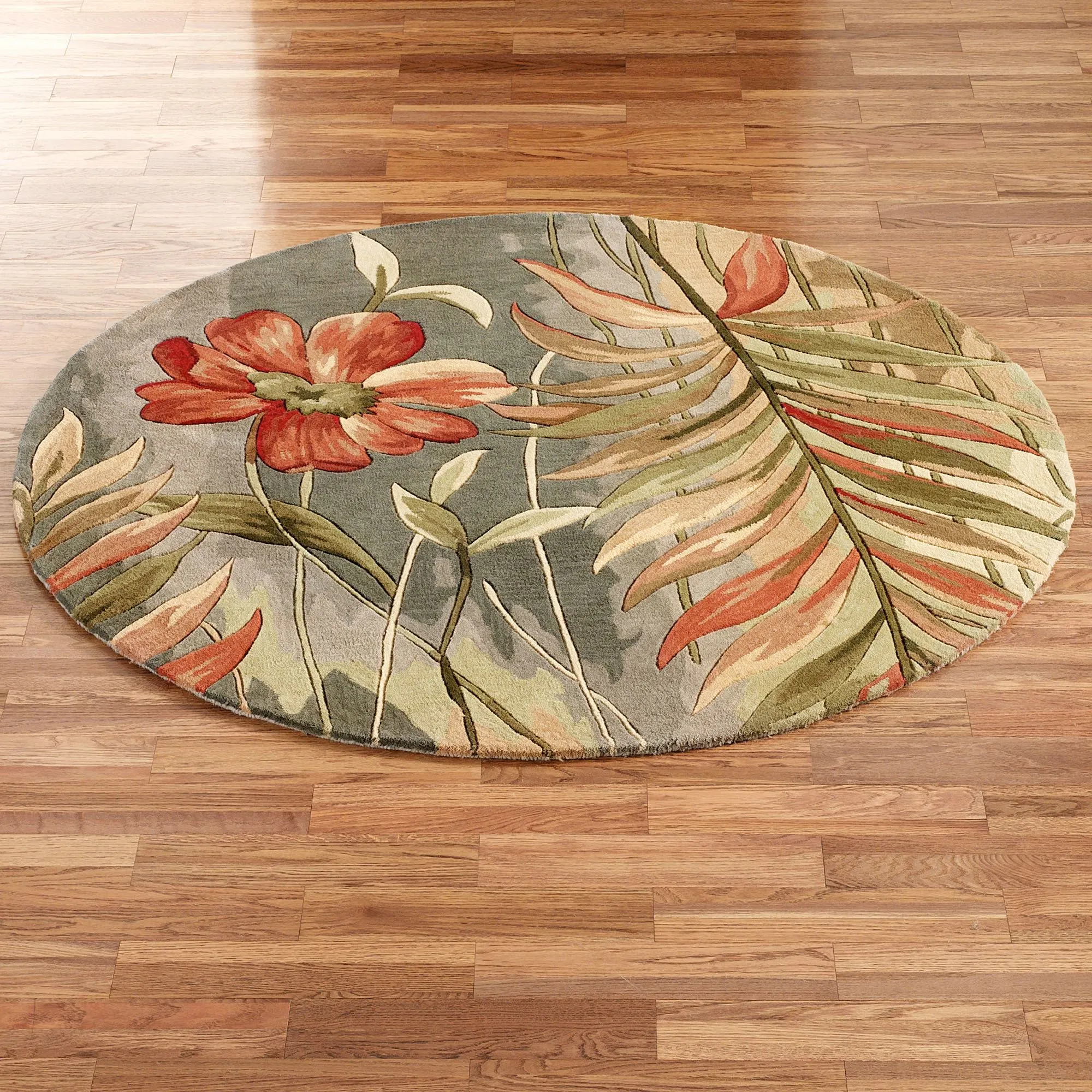 Place a tropical paradise in your home with the handcarved Island Oasis Area Rugs. The field features waves of exotic color adorned with an oversized palm frond and tropical flower design. The frond and floral design includes colors of burgundy, brick, ember glow, loden, cypress, fern, cream, camel, tan, cocoa, and auburn. The background includes shades of dark gray, gray, light gray, loden, cypress, fern, tan, and cocoa. Pure wool floor accents, .75" thick, are finished with an antique vegetable-dyed look and have an abrash effect. Hand-tufted in India. Backing is cotton-covered latex. We recommend professional cleaning by a rug cleaner.