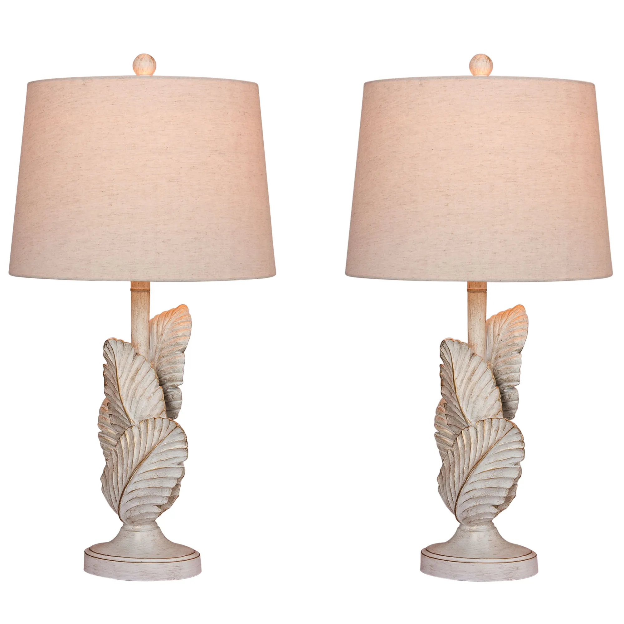 Detailed palm leaves add exotic style to the Island Tropics Table Lamp. Made of resin, this table lamp features palm fronds with an antique white finish and brown distressing. The linen fabric shade is cream. UL listed. Requires one 100W max. 3-way bulb. Measures 14"dia.x27.5"H, including the finial.