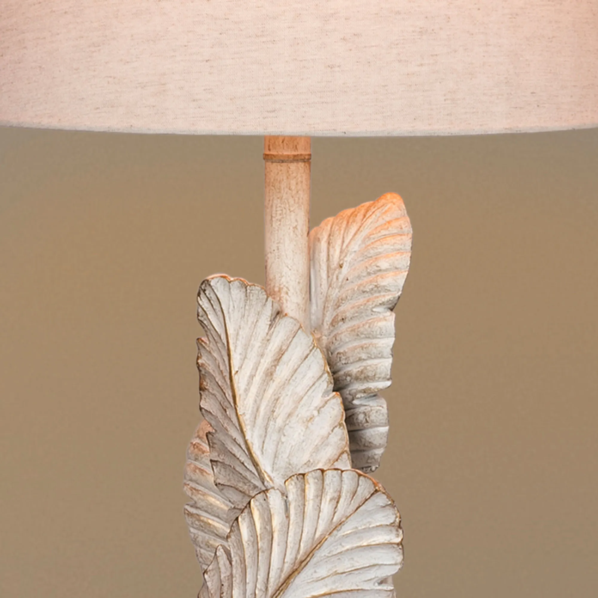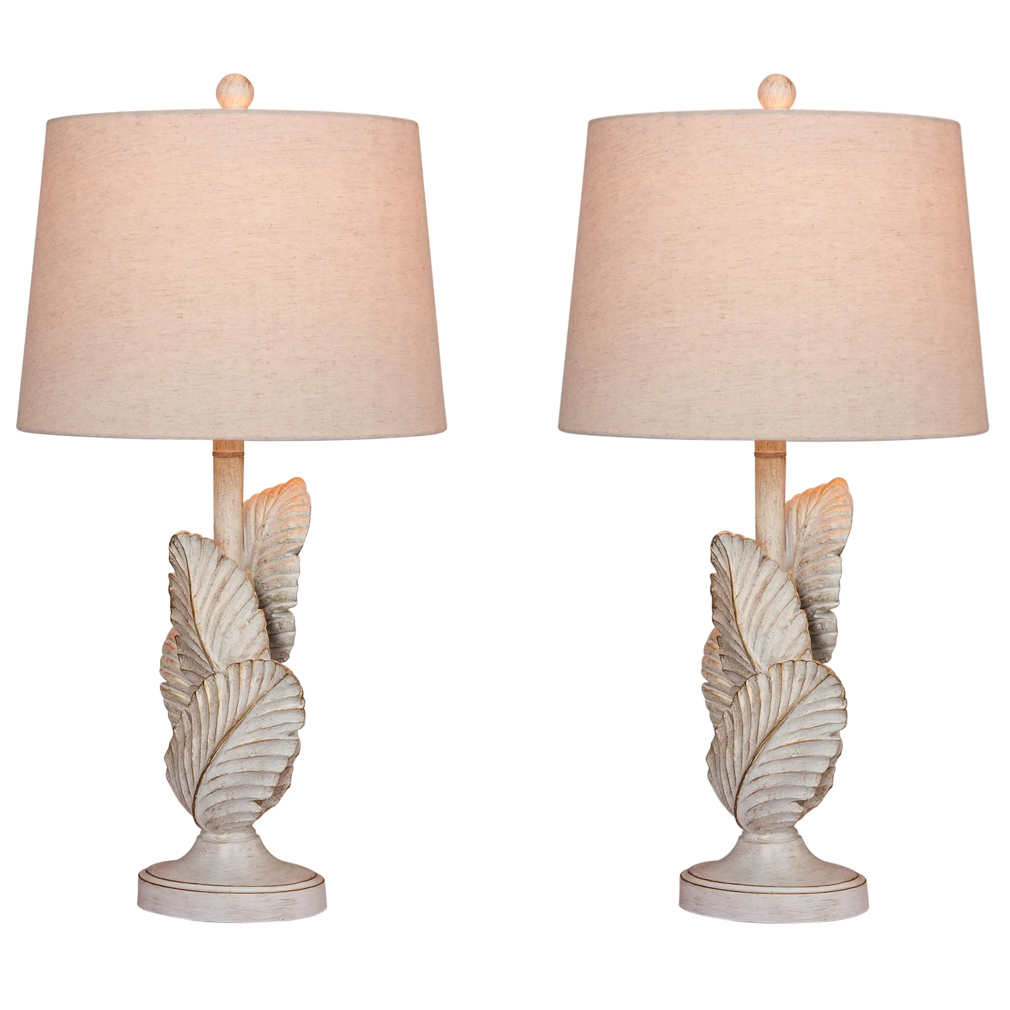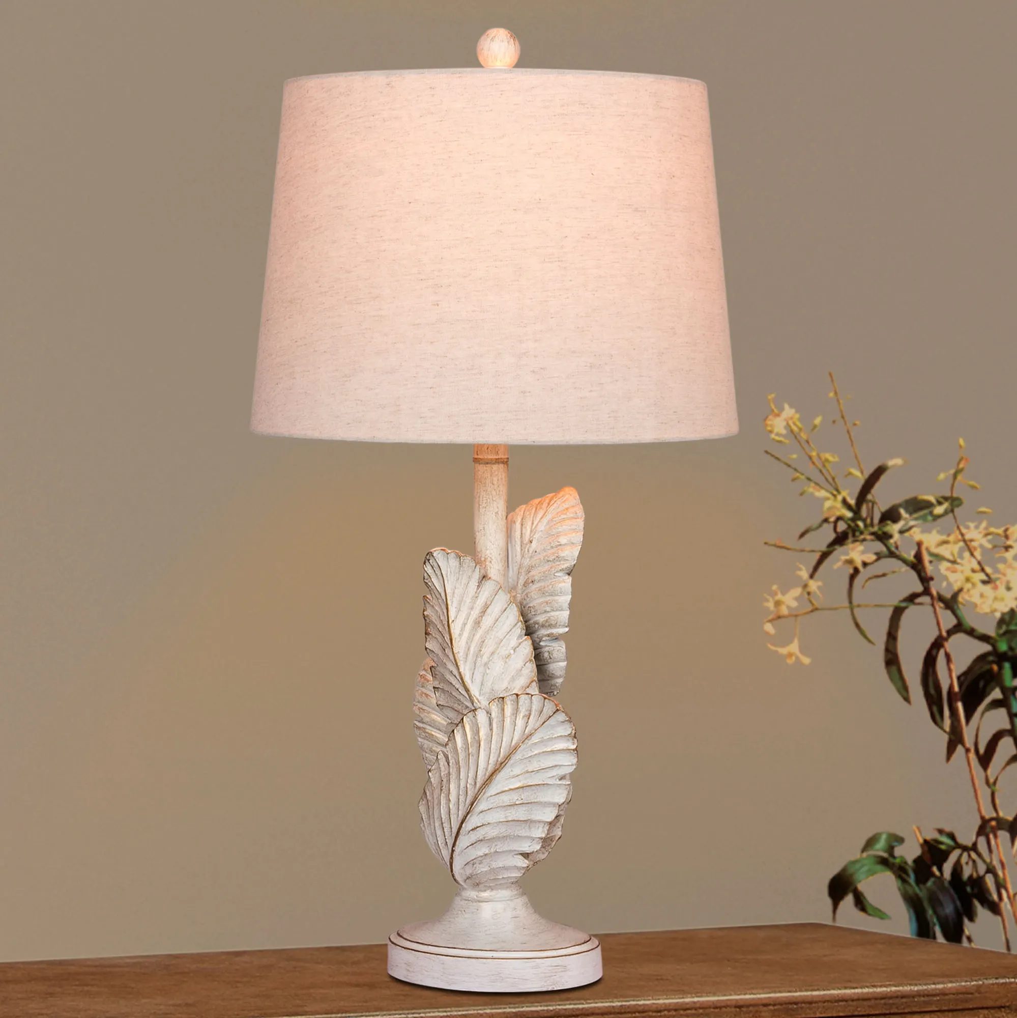 Detailed palm leaves add exotic style to the Island Tropics Table Lamp. Made of resin, this table lamp features palm fronds with an antique white finish and brown distressing. The linen fabric shade is cream. UL listed. Requires one 100W max. 3-way bulb. Measures 14"dia.x27.5"H, including the finial.