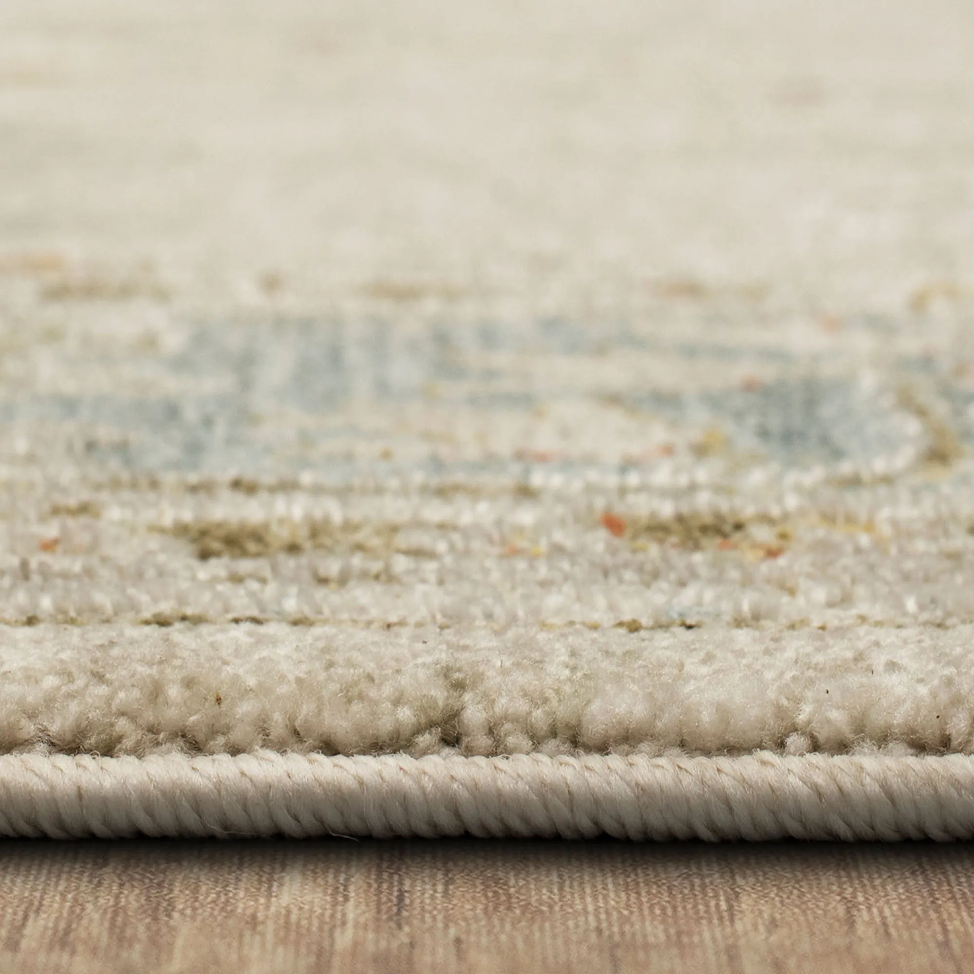 The Ivette Ivory Area Rug celebrates traditional style. Power-loomed from a polyester/polypropylene blend, the .35" thick rug features classic palmette and vine designs throughout the variegated field and detailed frame. A hi-low texture, stain-resistant neutral tones, and .5"L ivory fringed trim complete the timeless design. The ivory coloration has a light blue frame and shades of parchment, tan, copper, rust, and light blue. Backing is cotton. We recommend professional cleaning by a rug cleaner. Imported.