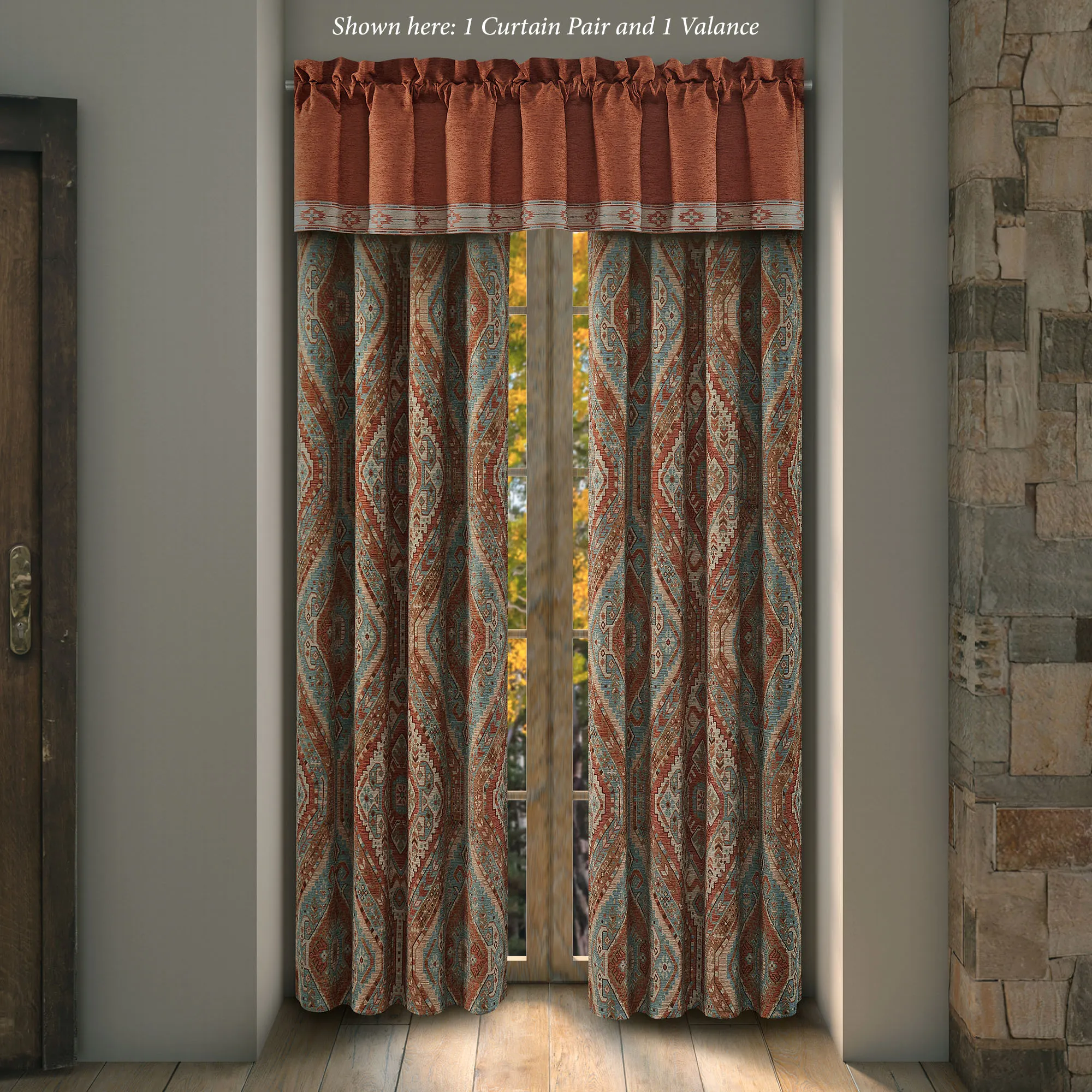 Tailored, lined Window Treatments have 3" rod pockets. Wide Curtain Pair has intricate Southwestern patterns and includes tiebacks. Curtains are available in two lengths. Valance is clay woven chenille with a woven chenille band and Southwestern embroidery at the bottom.