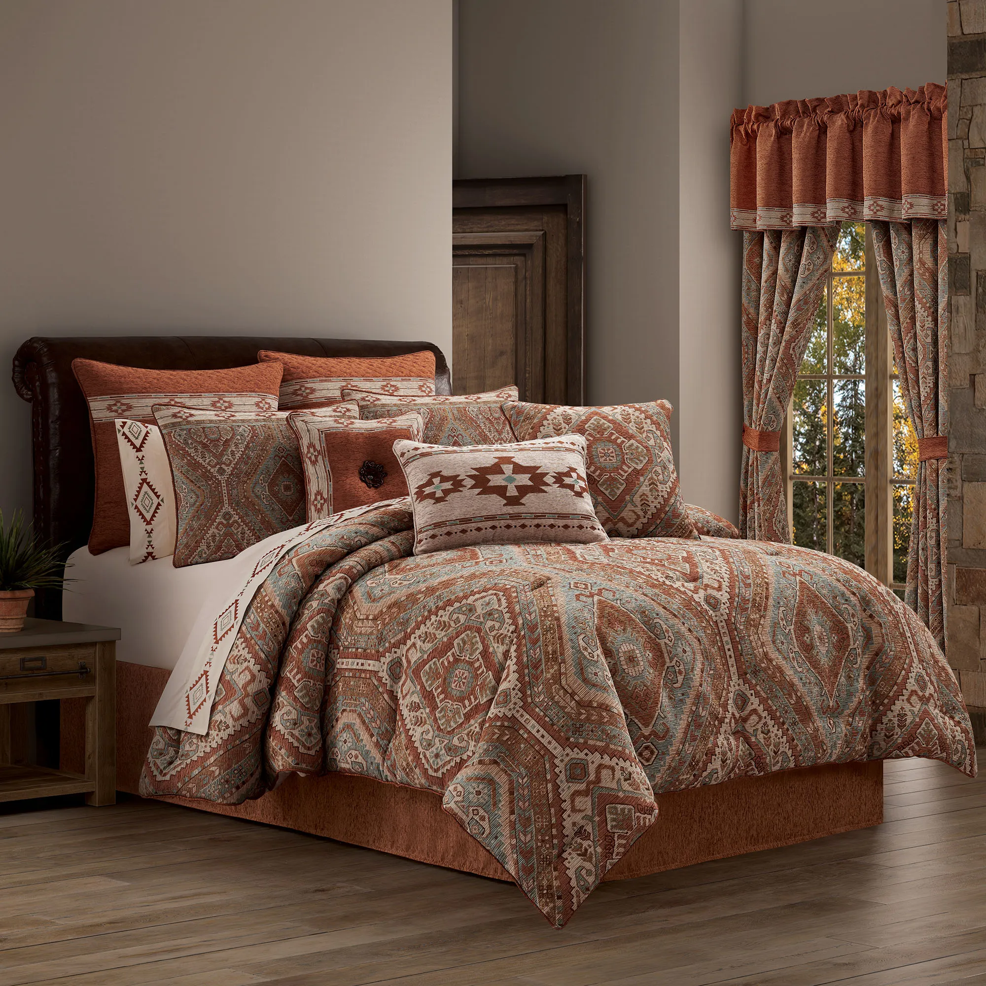 The Comforter Set includes comforter, bedskirt, and two shams. Oversized comforter fits mattresses up to 15". Comforter has woven chenille Southwestern designs, piped ends, and a solid dark beige polyester microfiber backing. Tailored, woven chenille bedskirt is a clay color with split corners and a 15" drop. Shams mimic the comforter and have an embroidered chenille band of Southwestern designs at the top, piped ends, and zipper closures. For comforter set, choose Queen, King, or Cal King.