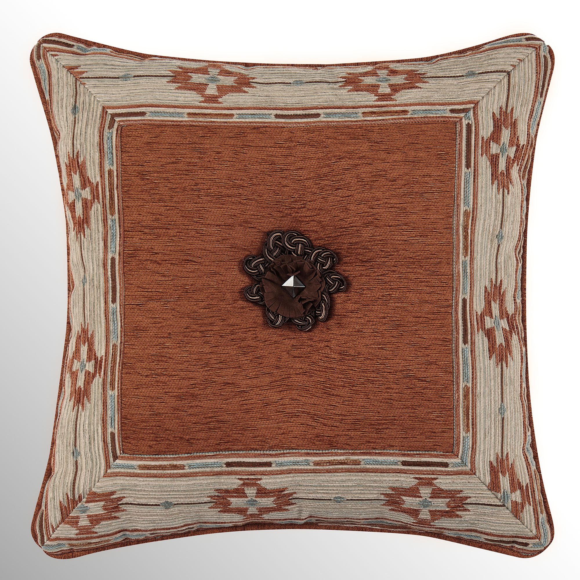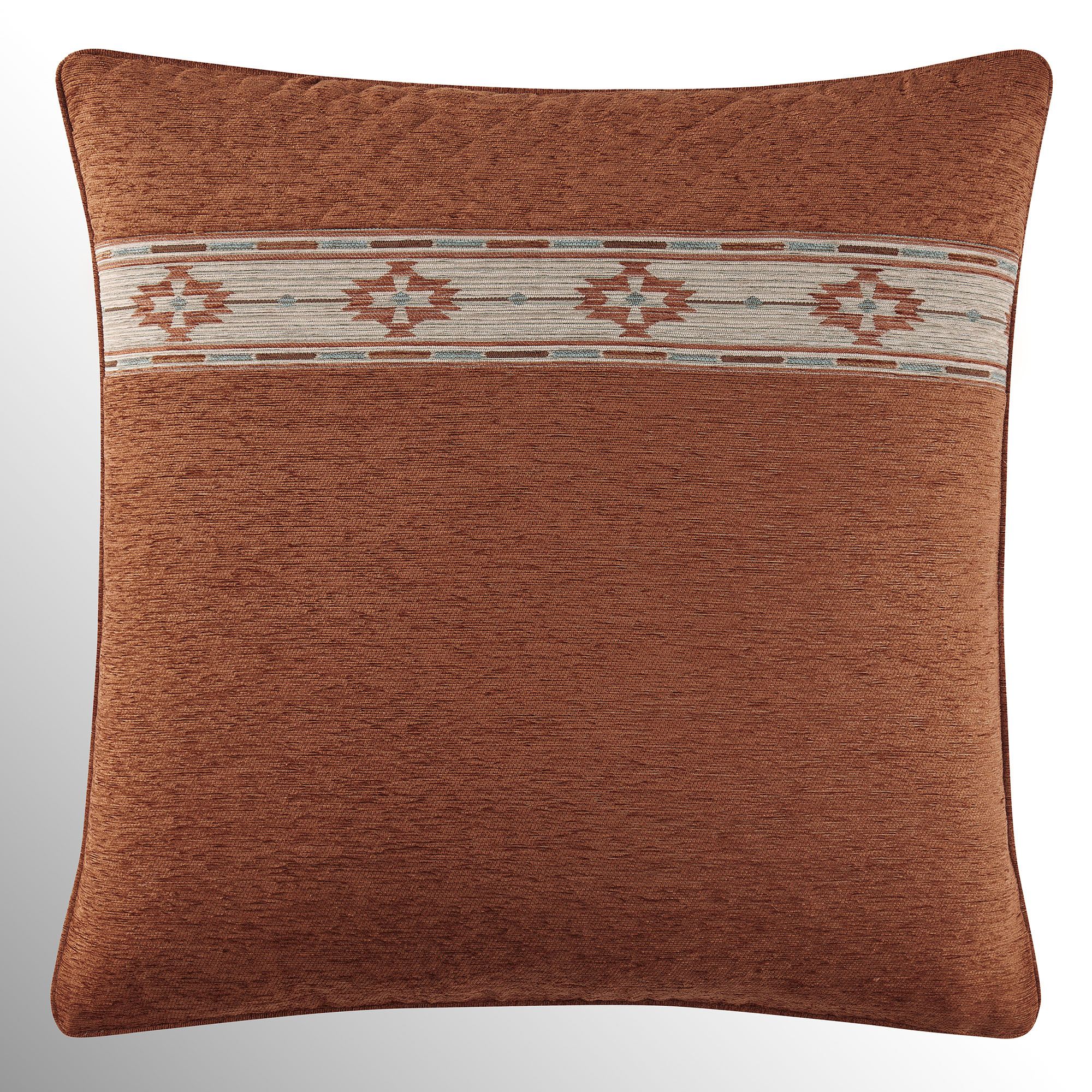 The woven chenille European Sham is a clay color and has diamond quilting at the top accented with an embroidered chenille band of Southwestern designs, piped ends, and a zipper closure.