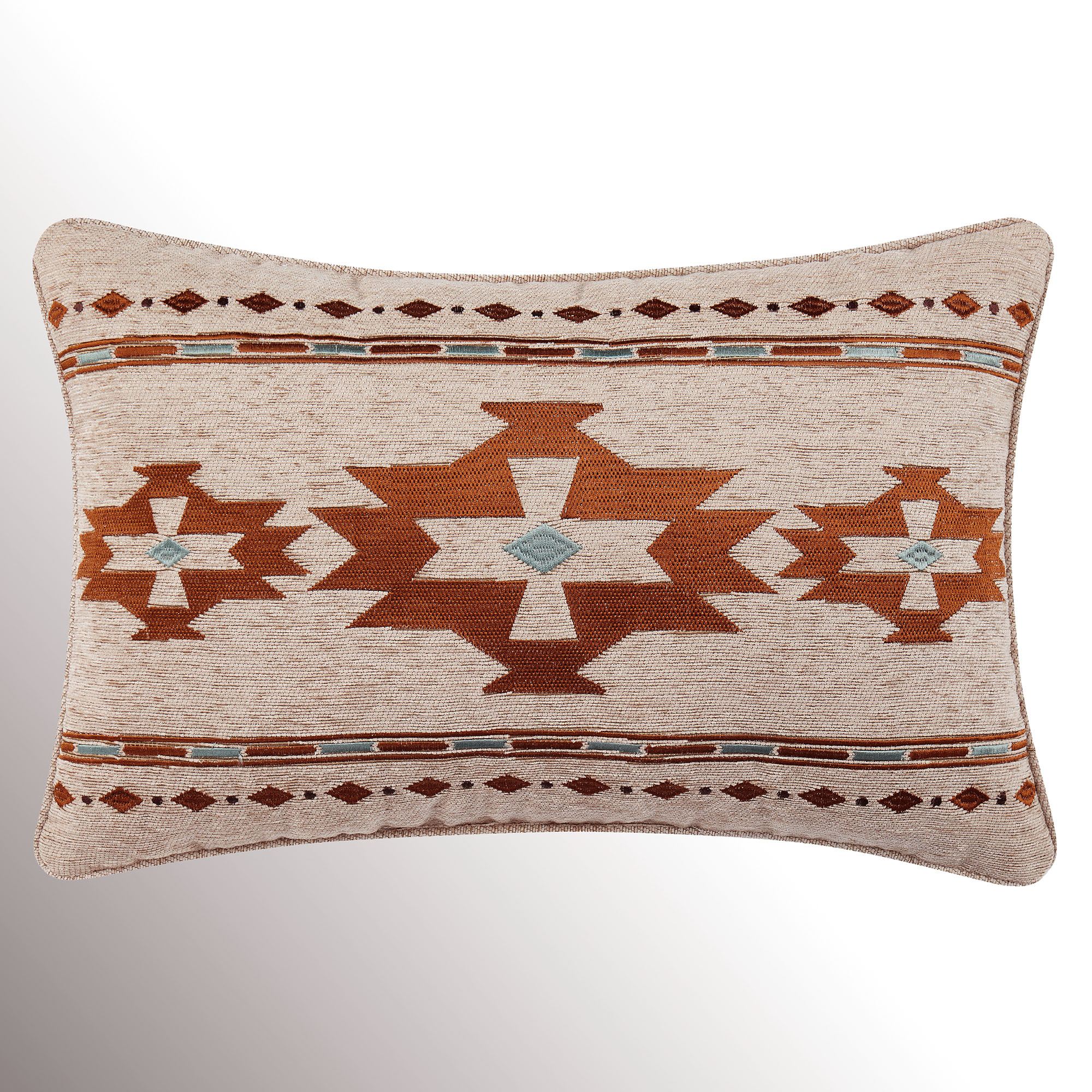 Pillows: Spot clean. The 18" Square has a solid clay woven chenille center, a mitred frame of Southwest chenille embroidery, a tufted, handmade iron button with brown and sand trim in the center, and piped ends. The 20" Square has intricate Southwestern patterns, piped ends, and a clay woven chenille backing. The Rectangle has woven chenille and embroidered Southwestern designs on sand, piped ends, and a sand woven chenille backing.