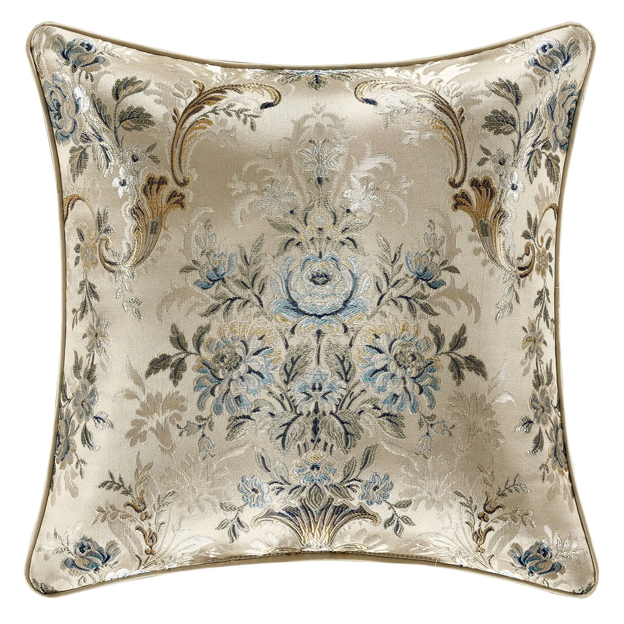 Beauty blossoms with effortless grace upon the Jacqueline Bedding from J. Queen New York. Jacquard-woven with exquisite shimmering detail, the polyester ensemble features blooming florals and classic scrollwork in soft blue, green, gold, beige, and taupe hues on a beige ground. Solid beige polyester satin accent elements elevate the design with further panache.