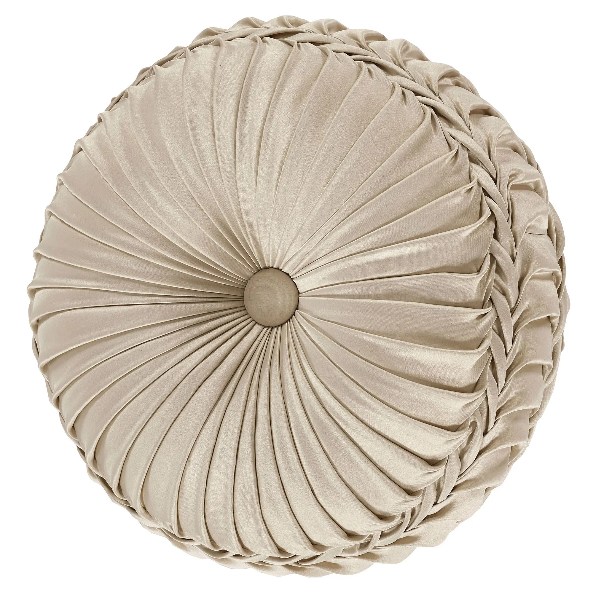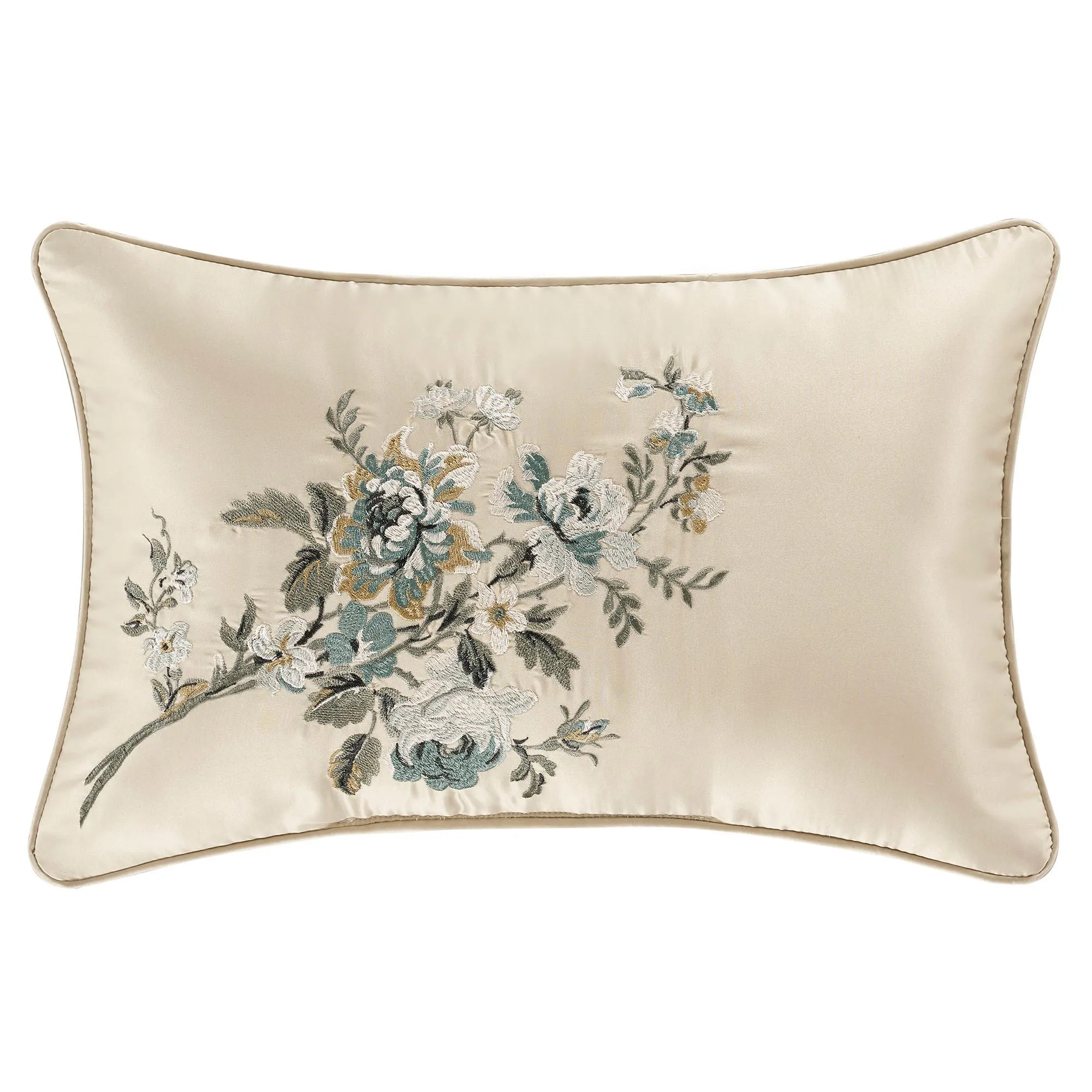 Pillows: Spot clean. Piped Square has florals and scrollwork. Piped Rectangle is beige polyester satin embroidered with coordinating florals. The handmade, reversible Round is beige polyester satin with pleats, a button-tuft center, and a 3" side gusset.