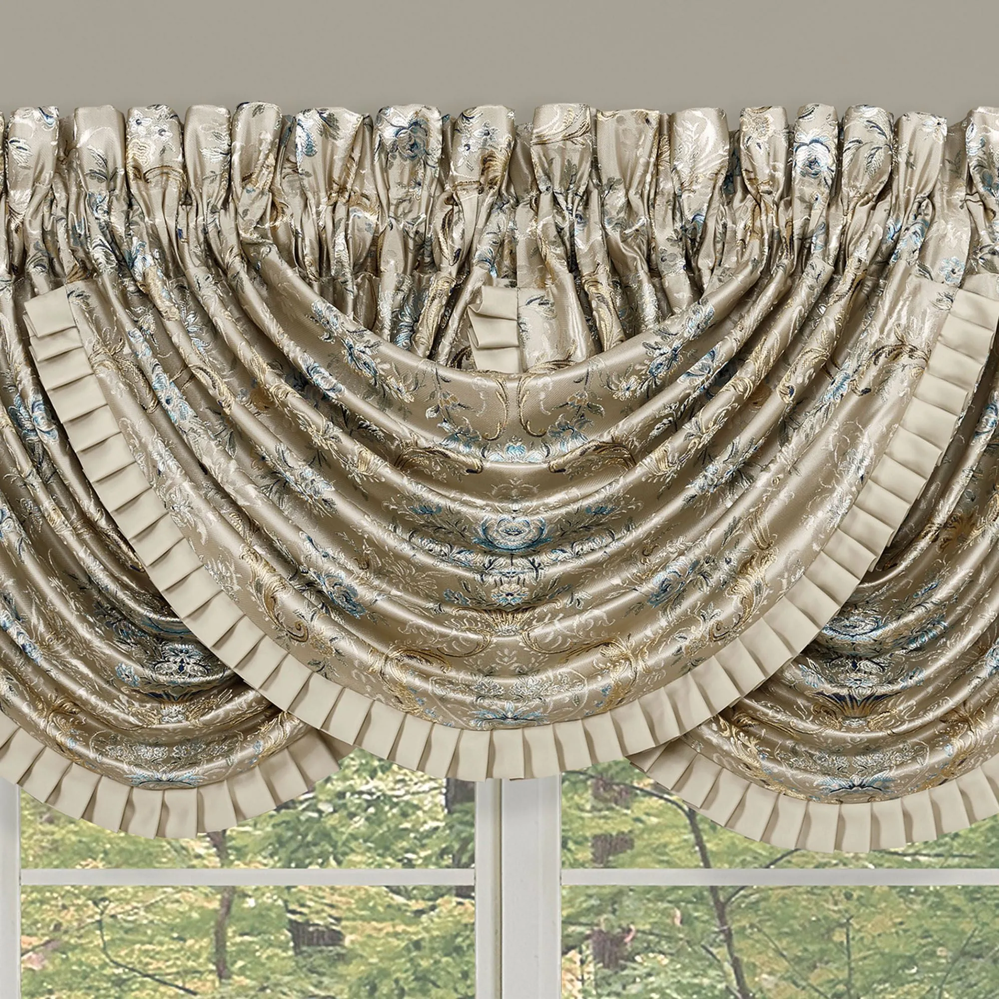 Window Treatments have florals and scrollwork. The lined Wide Curtain Pair has tailored edges, includes tiebacks, and hangs from a 3" rod pocket. Each Waterfall Valance has a pleated flange edge and a 3.25" rod pocket. We recommend one valance for every 12"-15" of window width.