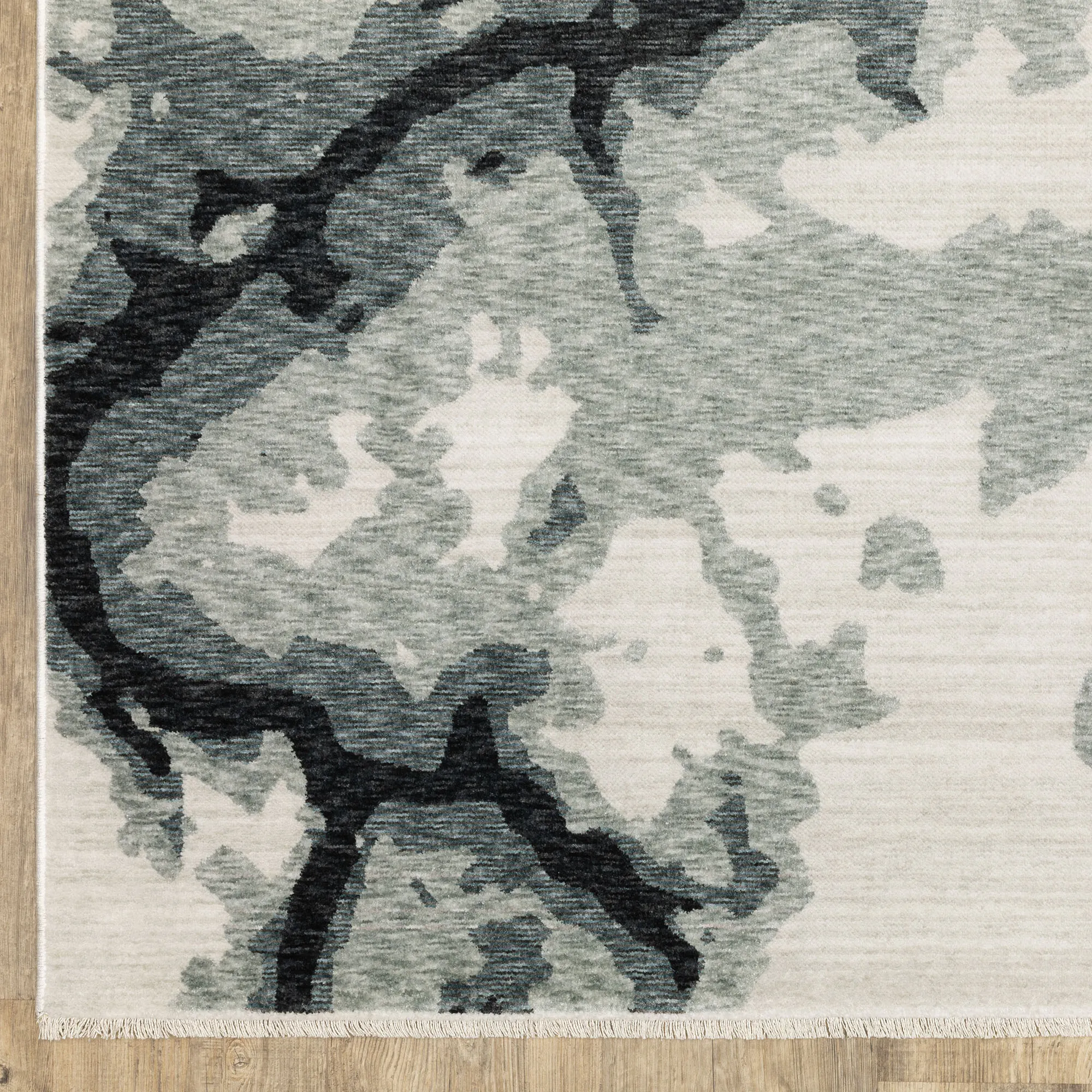 Beautiful neutral tones craft the look of natural stone upon the Jaida Rug. Power-loomed from soft polyester, the .32" thick textured rug features a space-dyed variegated look throughout the ivory background and parchment, pale aqua, black, and blue abstract design. The .5"L fringe ends add further charm. Backing is woven polyester. We recommend professional cleaning by a rug cleaner. Imported.