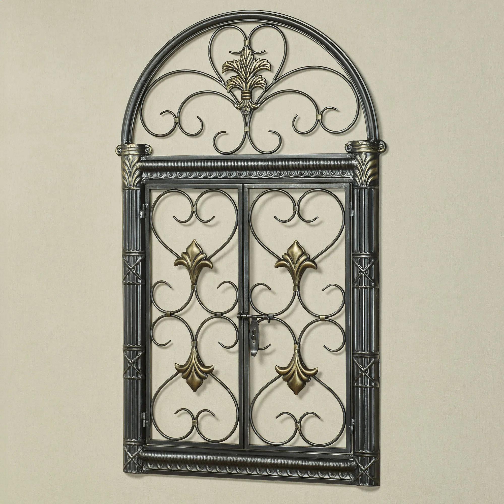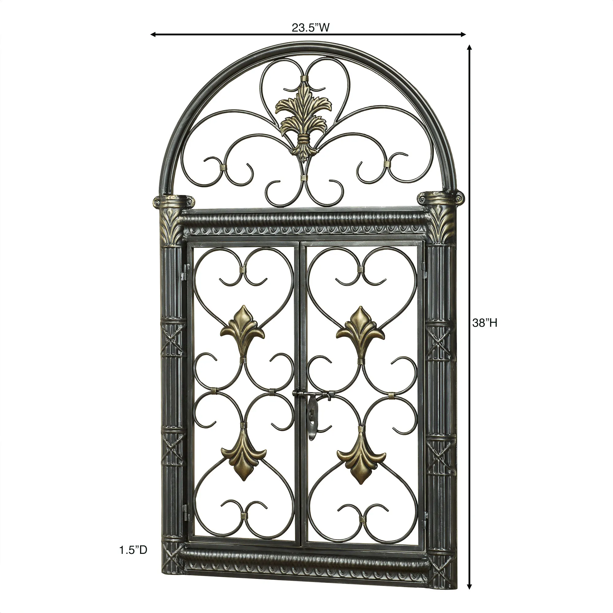 The traditional style of the Jameson Wall Grille displays classic swirling scroll motifs and fleur designs. This arched metal wall grille has a black finish with a silver wash and gold accents. Use the latch to "open" the panels in the center. Measures 23.5"Wx1.5"Dx38"H.