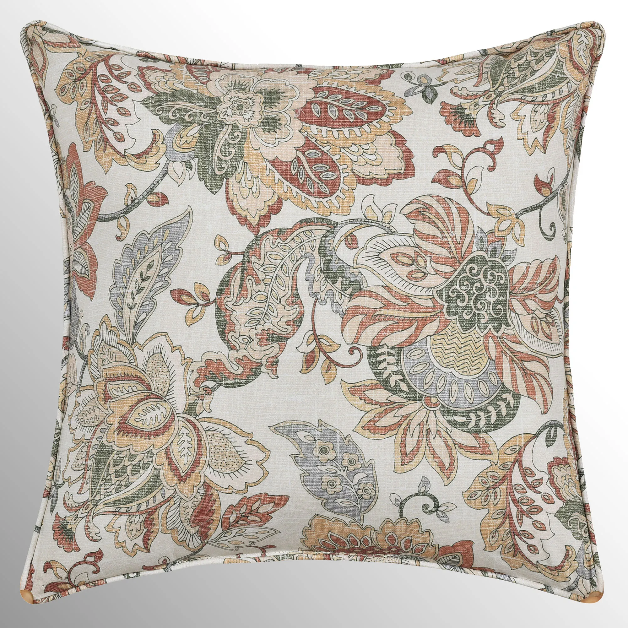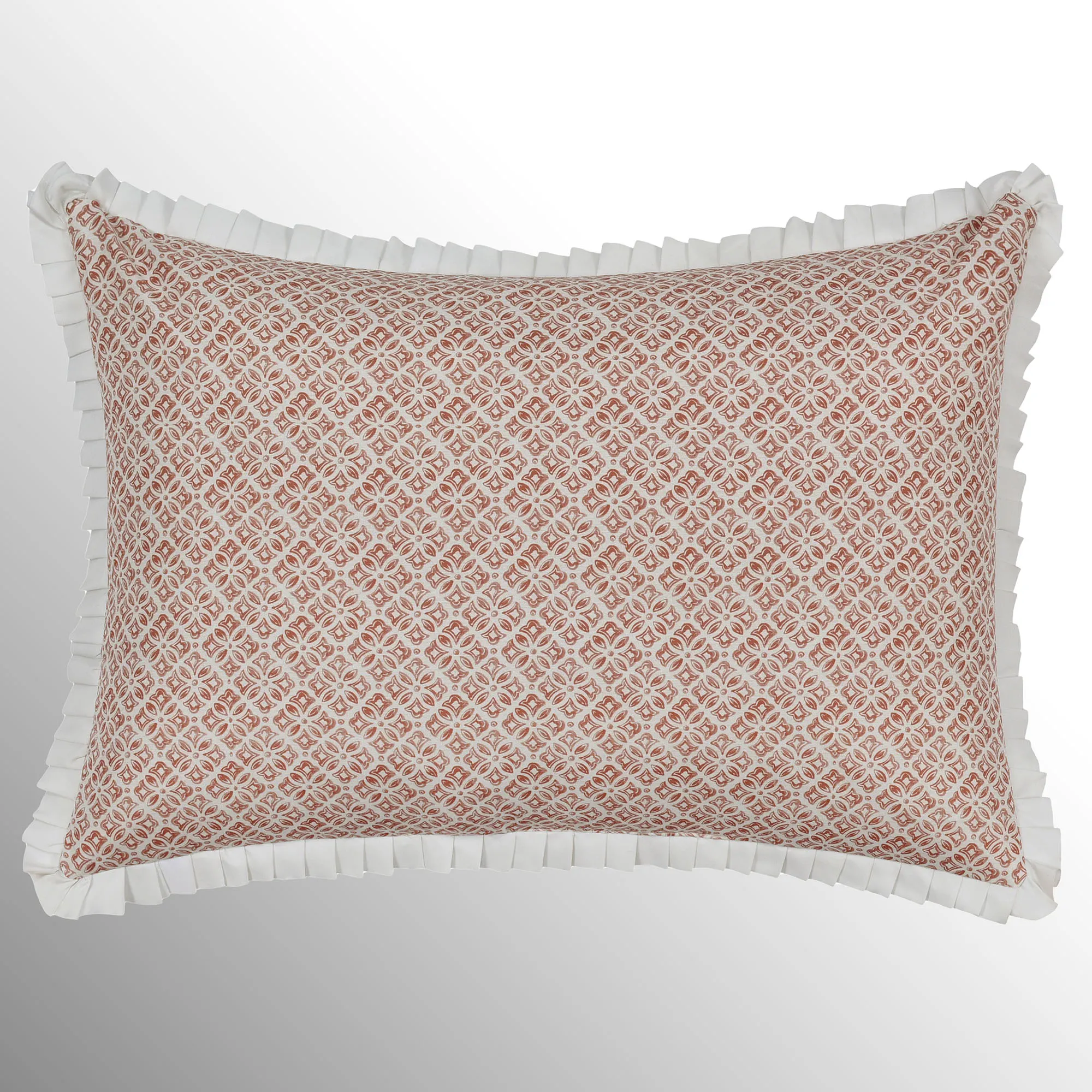 Reversible Pillows: Spot clean. The 16" Square has embroidered coordinating florals on ivory with piped edges. The 18" Square has piped edges. Rectangle has tile motifs and ivory pleated flange edges.
