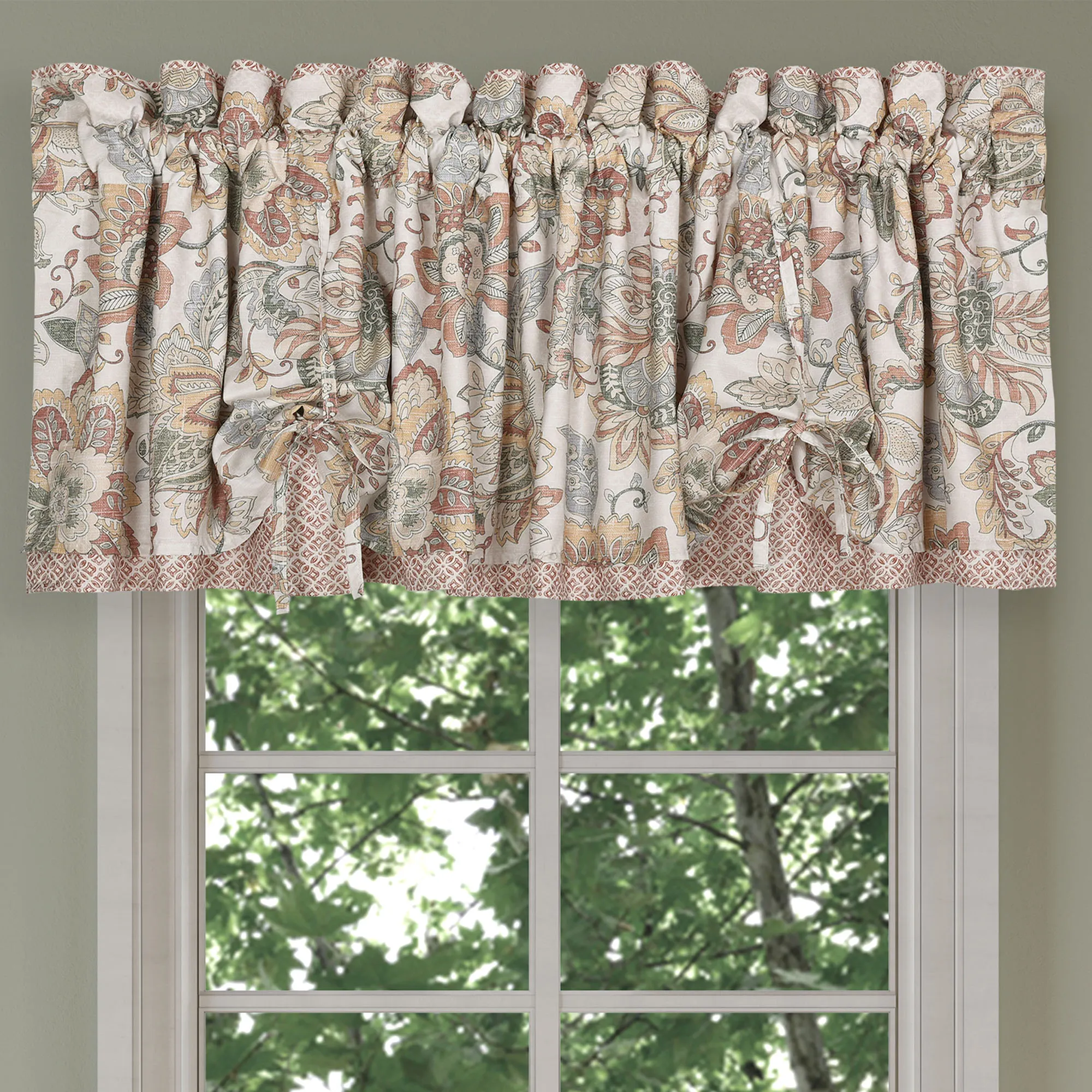 Lined Window Treatments have tailored edges and 3" rod pockets. Curtain Pair includes tiebacks. Tie-Up Valance features a tile-motif bottom layer and two tie accents.