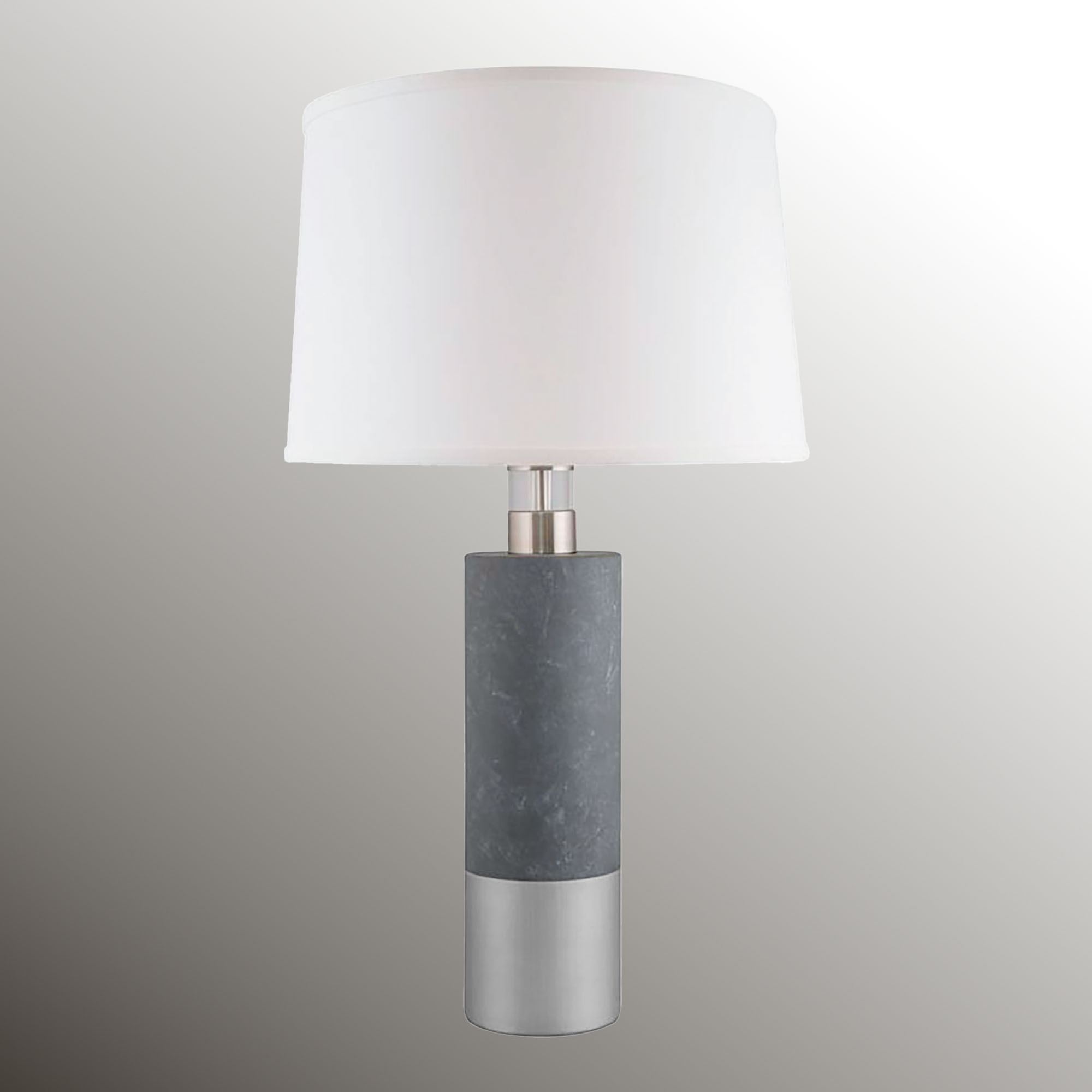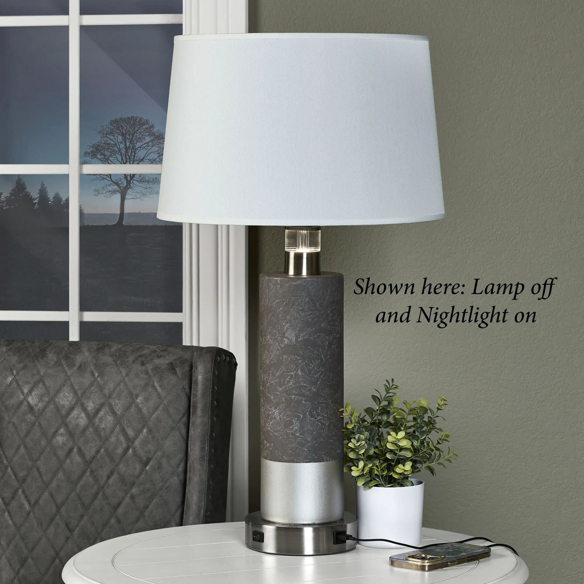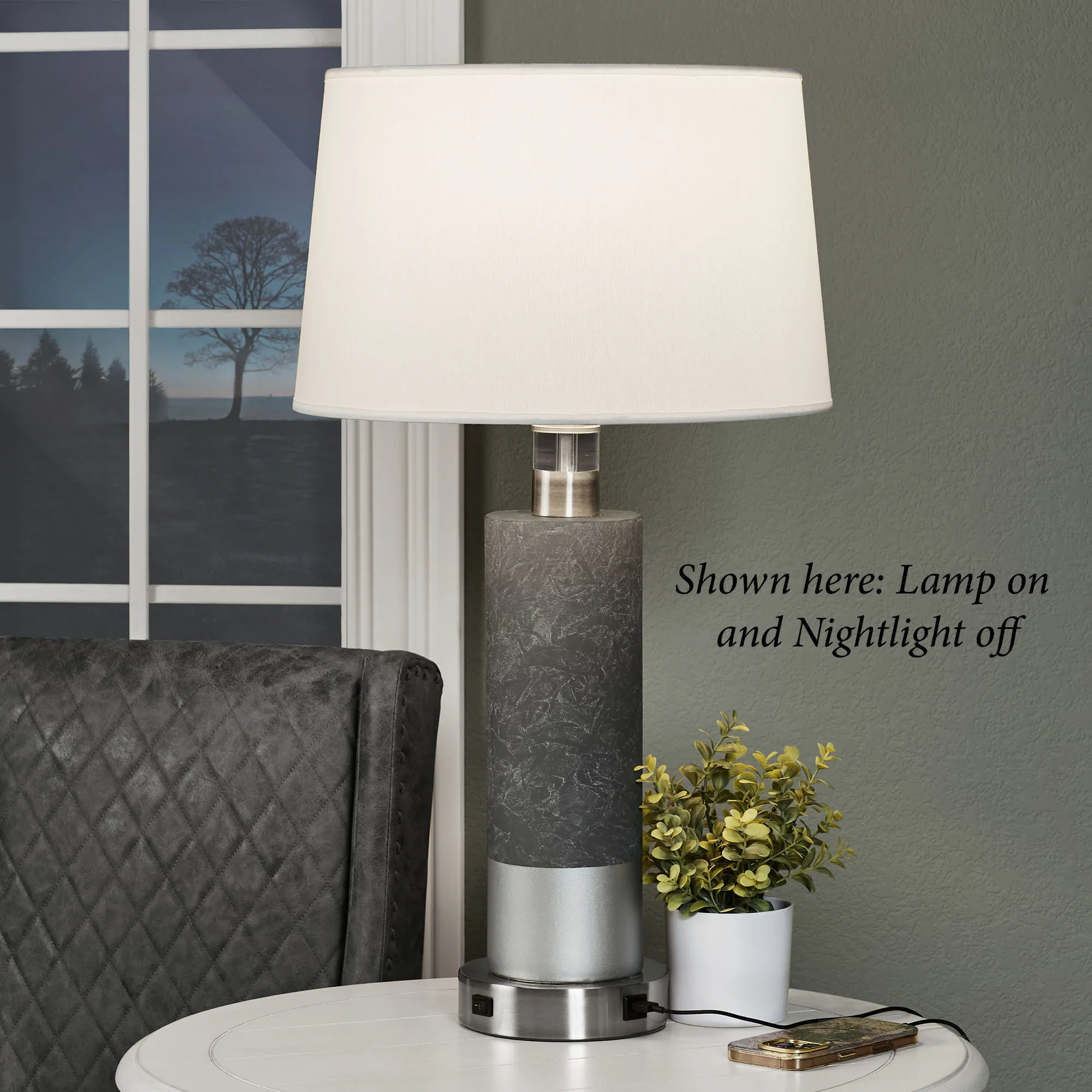 Style a space with the modern convenience of the Jaxtyn Table Lamp with Nightlight. Handcrafted in the USA from local ceramic clay, the lamp features a sleek column hand-finished in dark gray and brushed silver. Beneath the white linen drum shade, a built-in nightlight shines via the clear acrylic accent at the top; a 7W LED nightlight bulb is included. An optional brushed steel mounting base, 6.5"dia.x1.5"H, adds further convenience with a built-in USB port, an outlet, and an on/off switch for the top light. UL listed. Requires one 100W max. bulb that operates via three-way lighting (top, nightlight, or both). Overall, the table lamp measures 16"dia.x29.5"H.