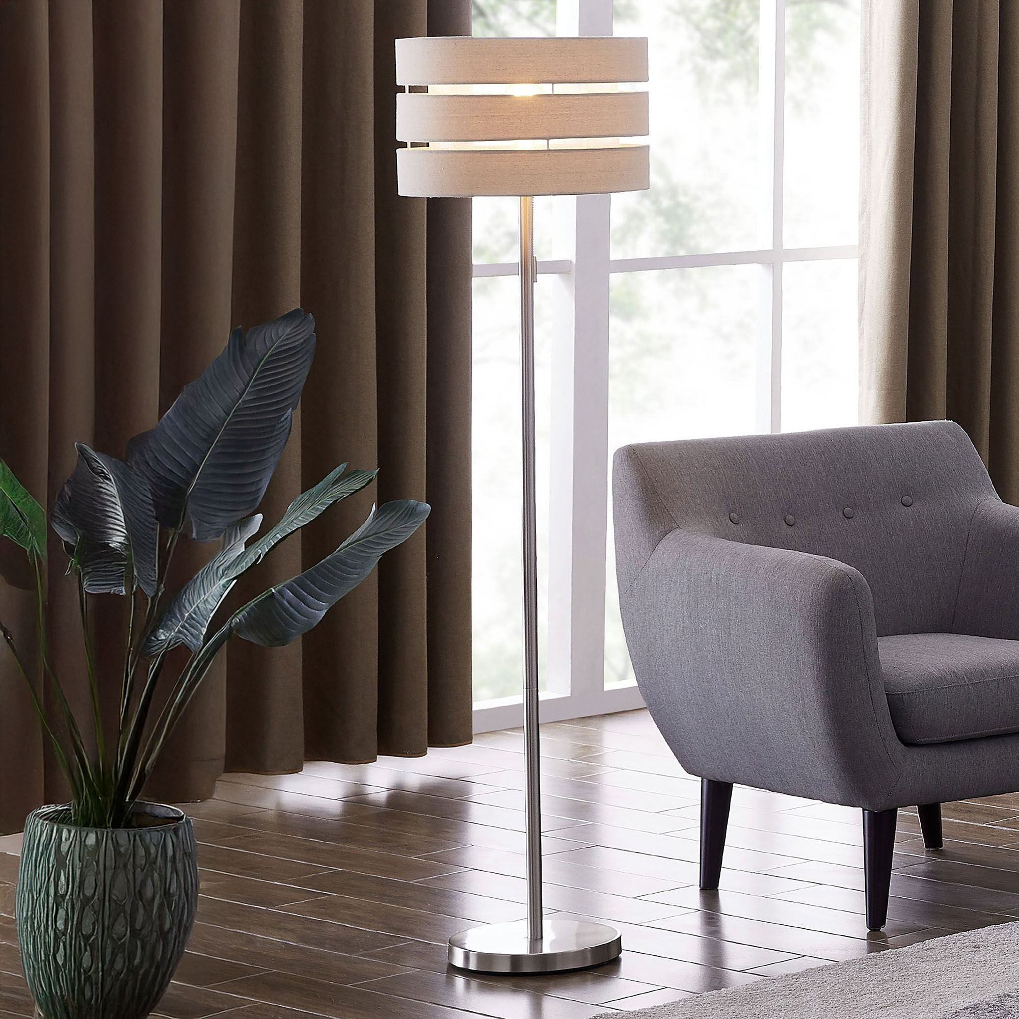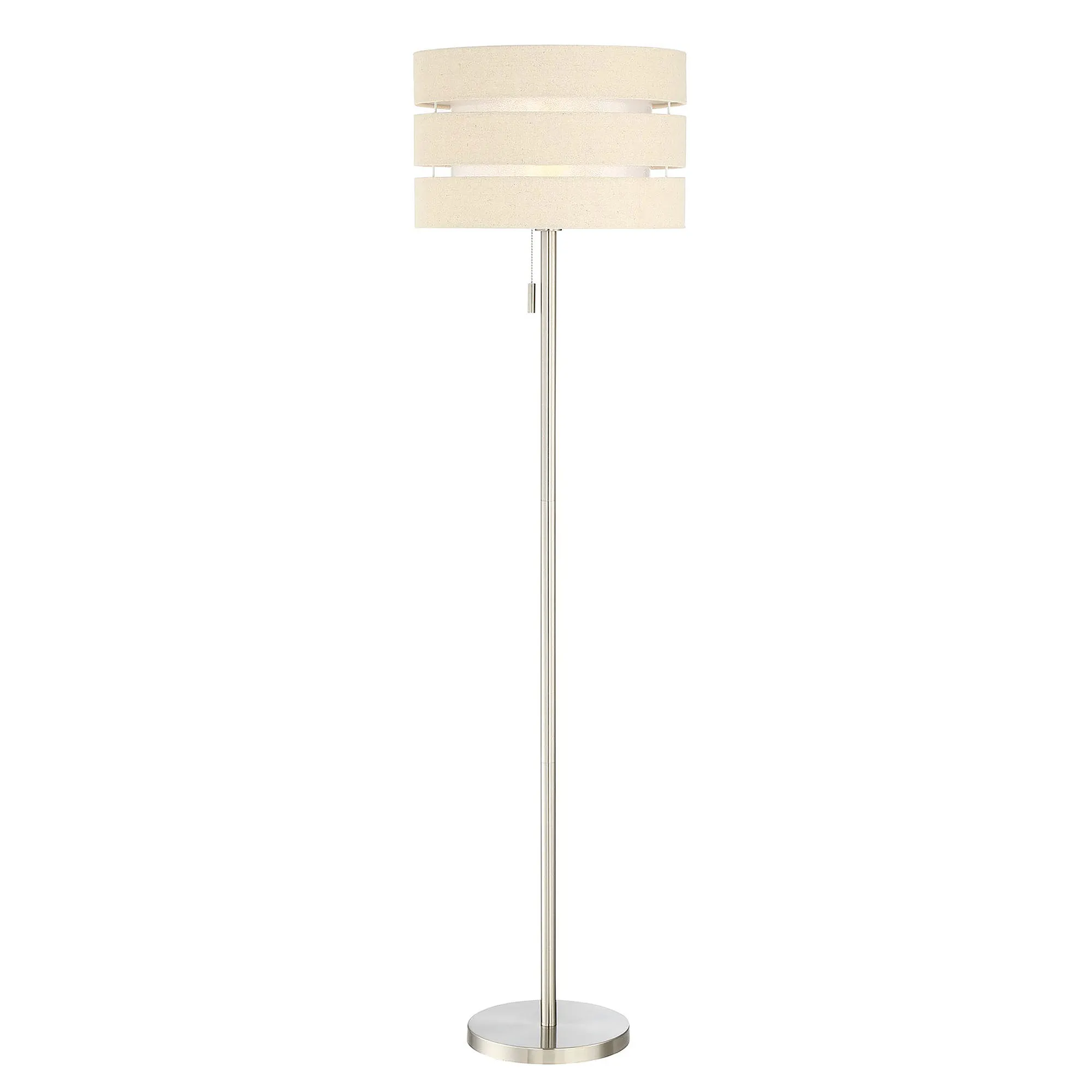 Illuminate your space with the undeniable style of the Jaycee Floor Lamp. With a sleek silver-finished metal base and pole, the chic floor lamp features a captivating double shade with linen horizontal stripes and inner sheer organza that diffuses the light. UL listed. Requires one 100W bulb that operates via a pull chain. Overall, the floor lamp measures 17"dia.x60.5"H and weighs approx. 15 lbs.