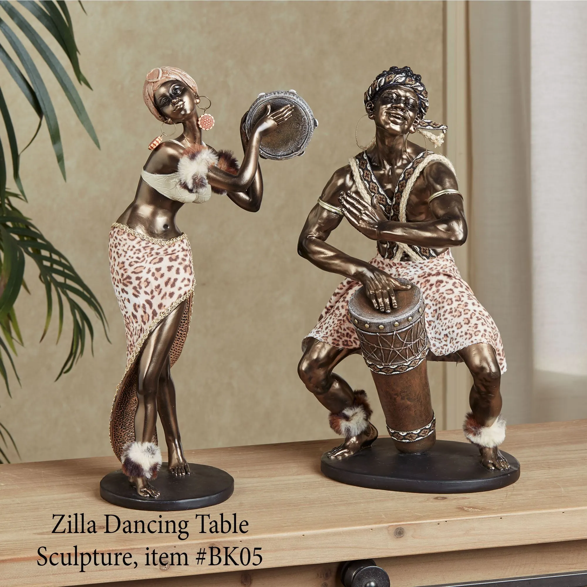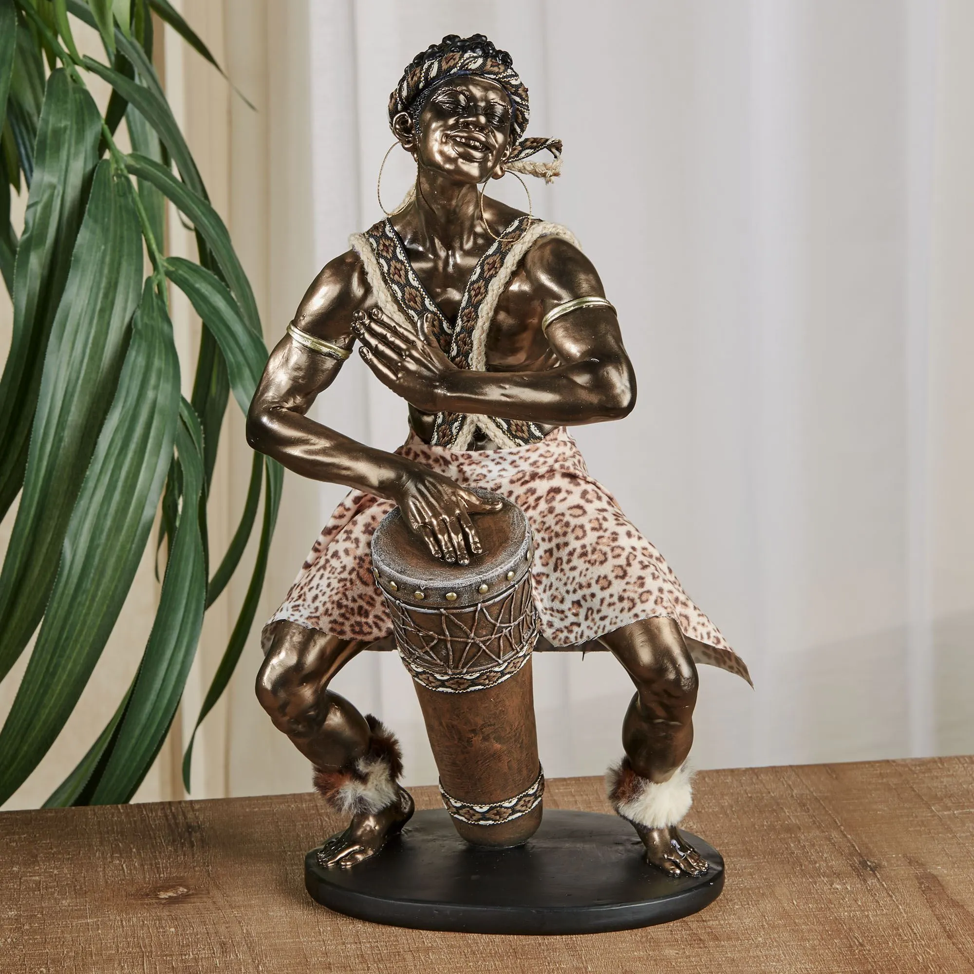 This Jembe Player provides a steady rhythm for ceremonial dances. The polyresin table sculpture depicts a man with a bronze finish wearing a leopard print outfit along with faux fur accents playing the jembe. Bottom base is black. Measures 8"Wx5.5"Dx16"H.