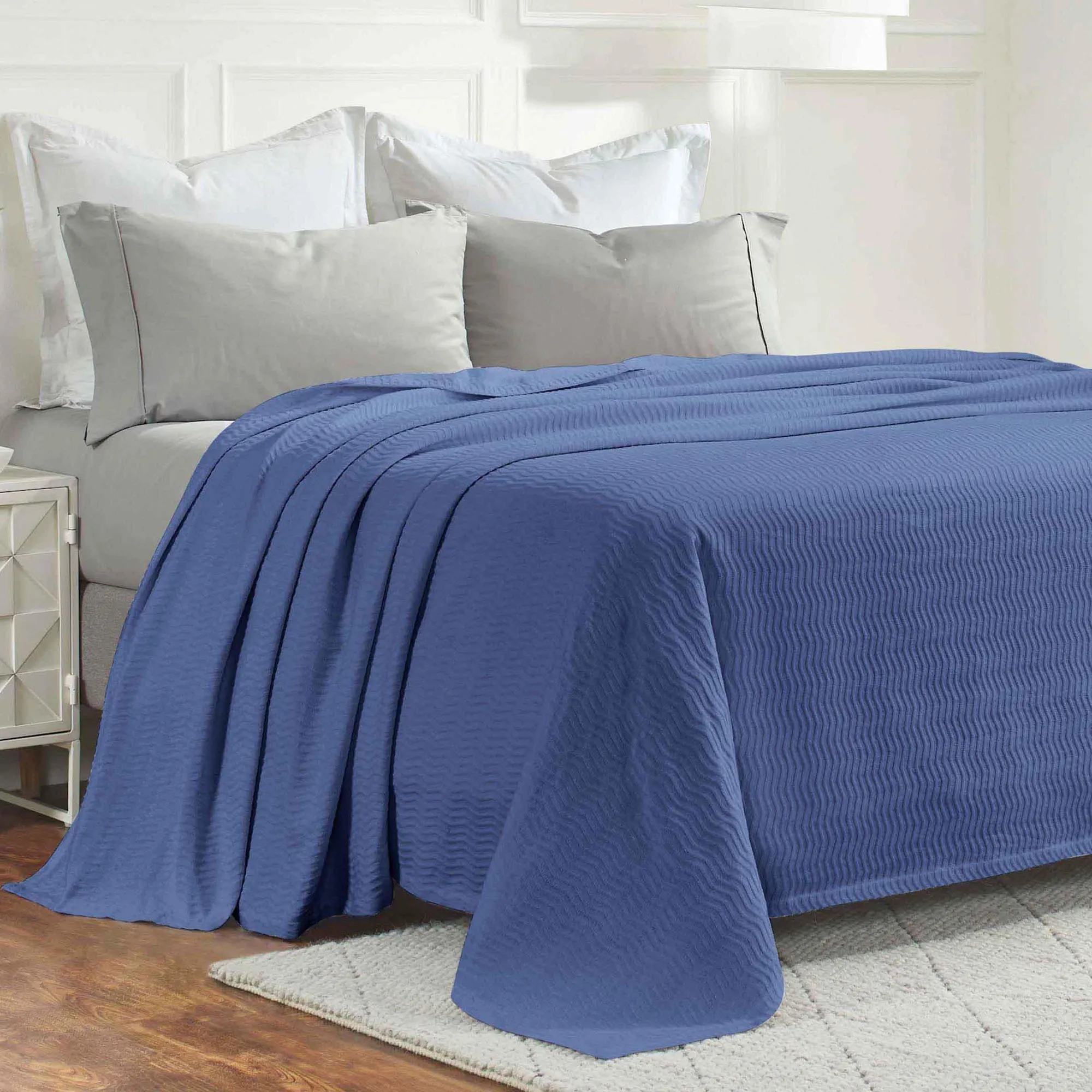 Keep warm, be cozy, and look cool doing it with the Jena Blanket. This solid color, hypoallergenic cotton blanket has a wave design and bound ends. The naturally soft, lightweight blanket has 300 GSM and is breathable. Machine washable. Imported.