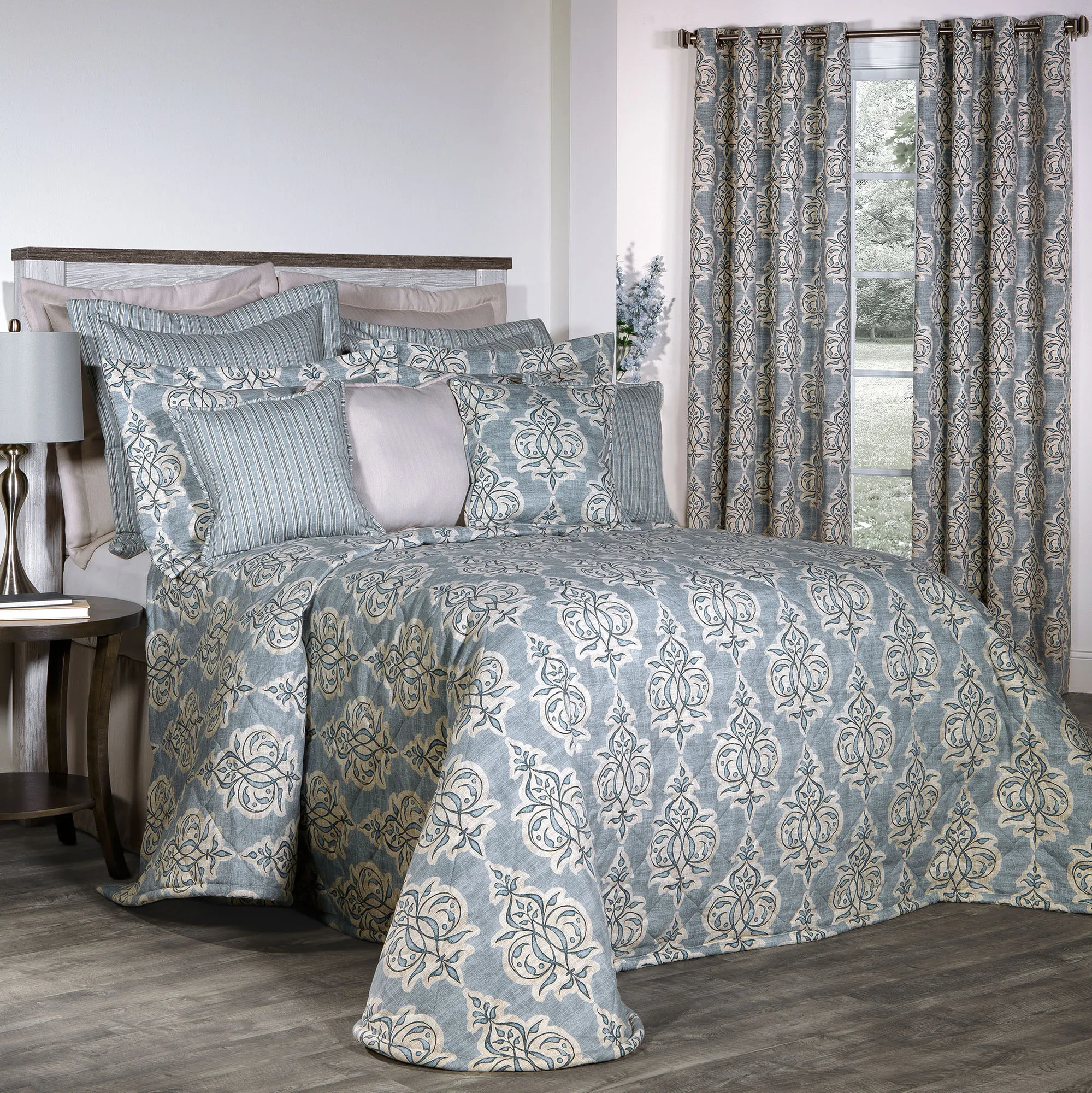 Elegantly display the leafy medallion designs on the Jenna Bedding. This cotton ensemble features classic printed motifs. Colors include shades of blue and beige.