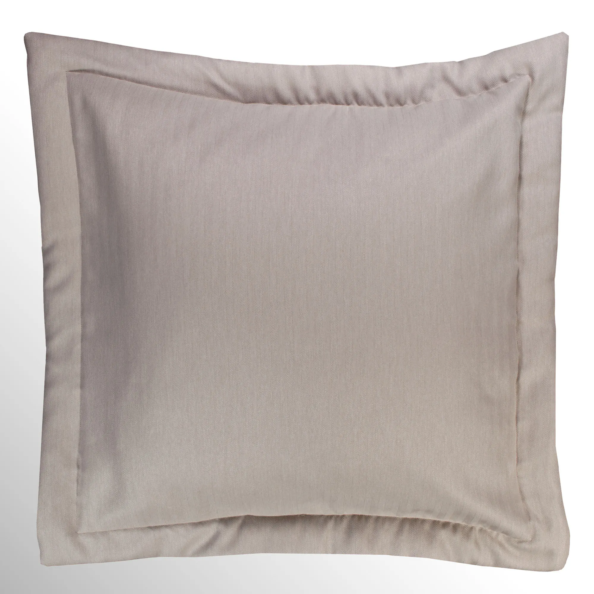 The Herringbone European Sham is polyester with a woven herringbone pattern in beige, flanged ends, and a French back closure.