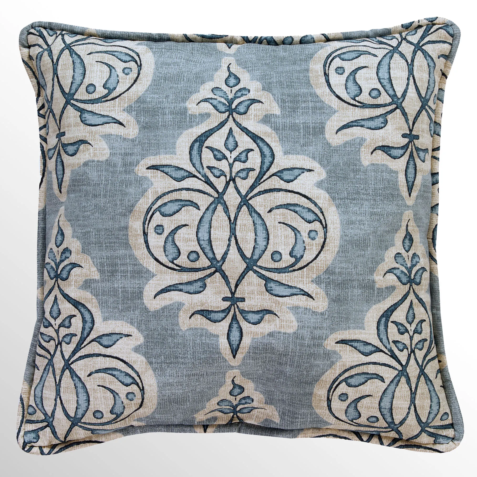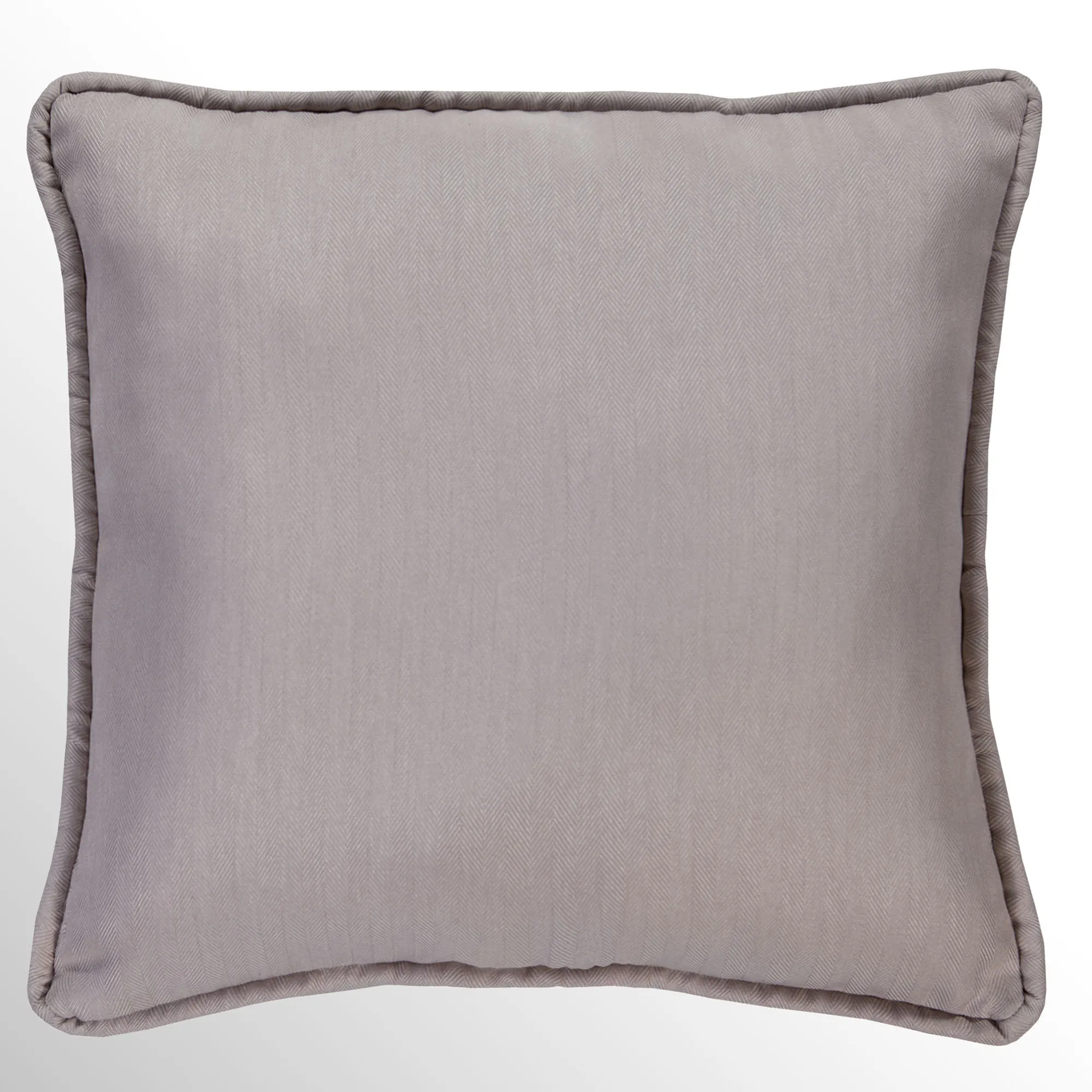 Piped Pillows are reversible. The Herringbone Square is polyester with a woven herringbone pattern in beige. The Piped Square has leafy medallion designs. The Striped Square has printed stripes.