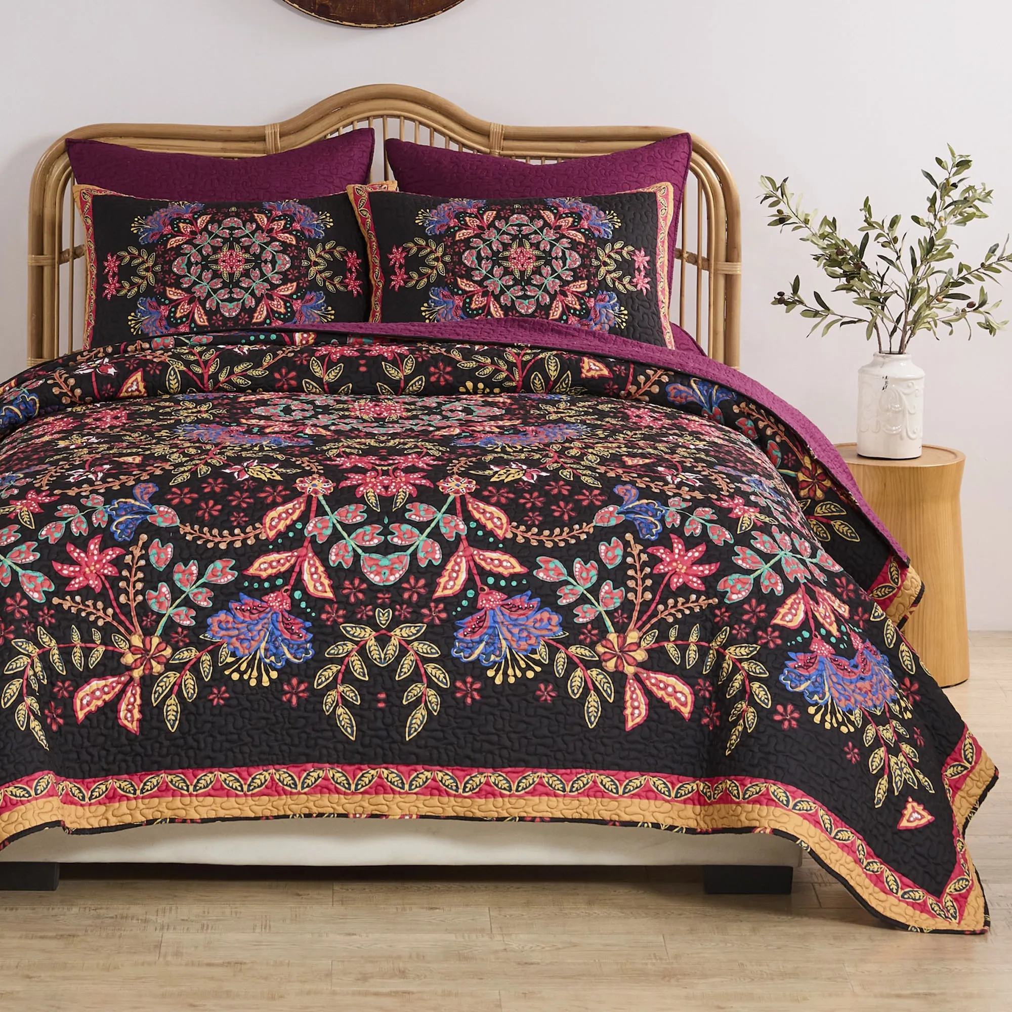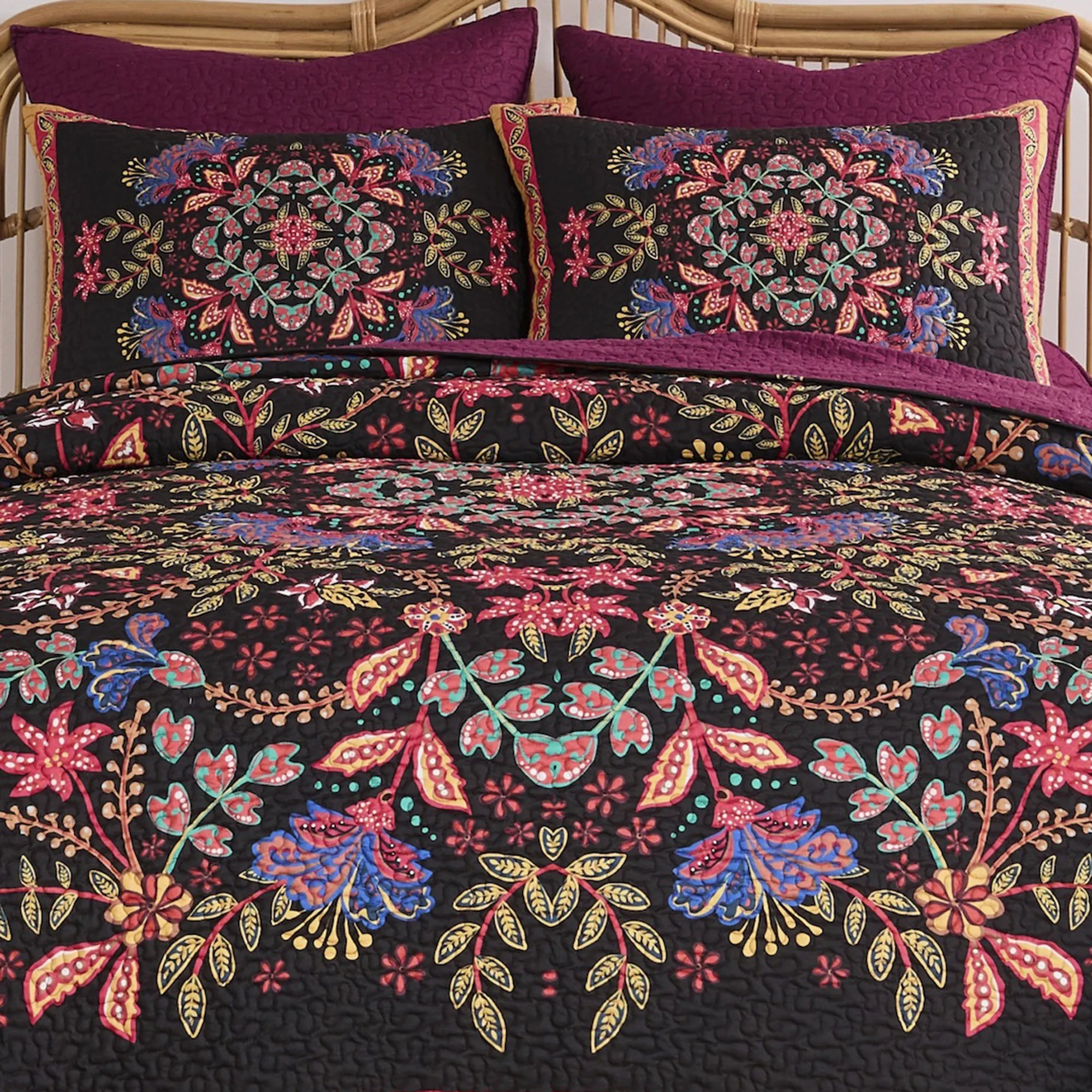 Jessa Bohemian Style Black Botanical Floral Mini Quilt Set Bedding