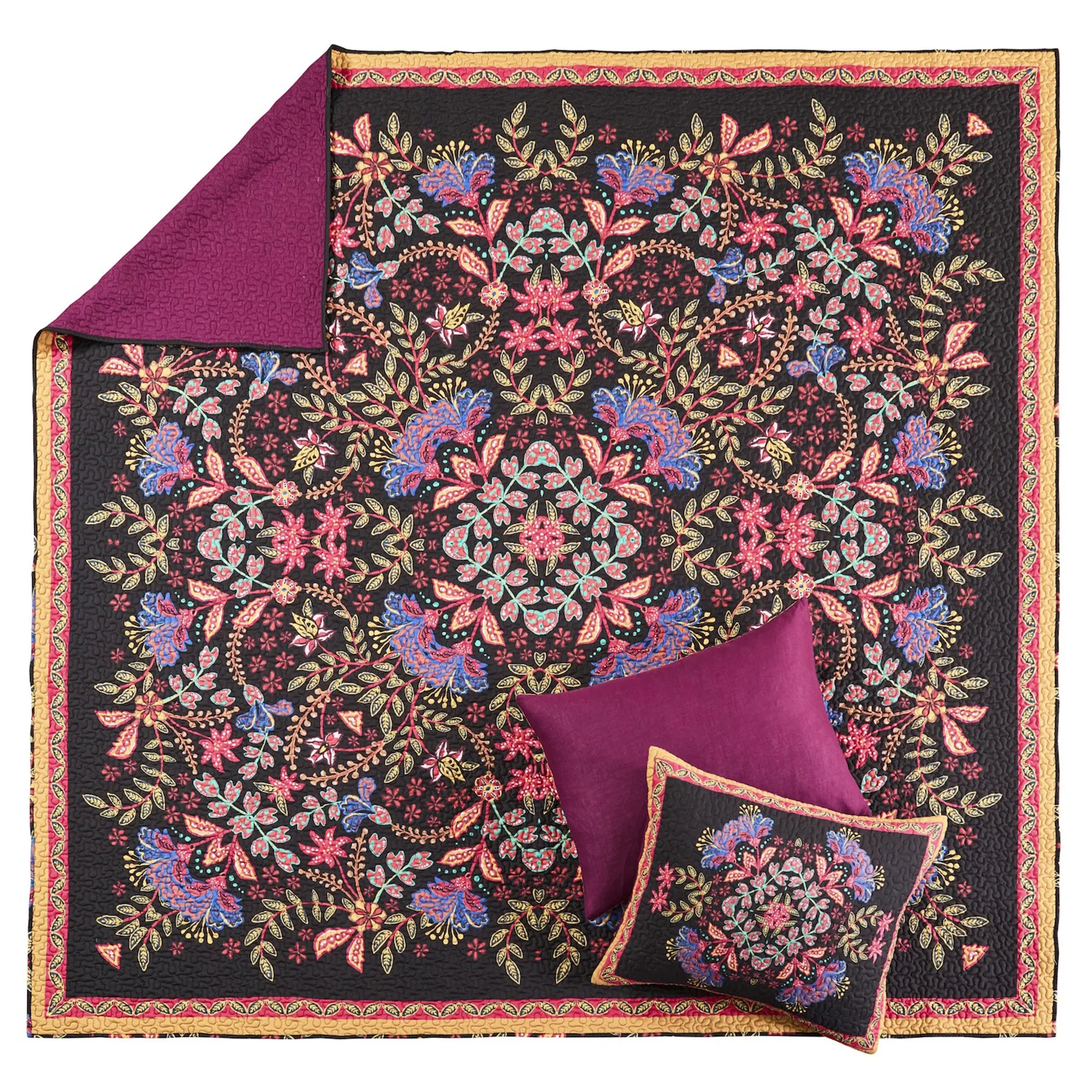 Florals flourish and thrive within the Jessa Bedding. The Mini Quilt Set includes a quilt and shams. Inspired by classic mandalas, the pre-washed and preshrunk polyester microfiber bedding features an intricate multitude of flowering and vining botanical motifs that pop from the black ground in coral, indigo, fern green, turquoise, white, and gold printed hues. Quilt is backed in merlot cotton. Fill is a cotton/polyester blend. Machine washable. Imported.