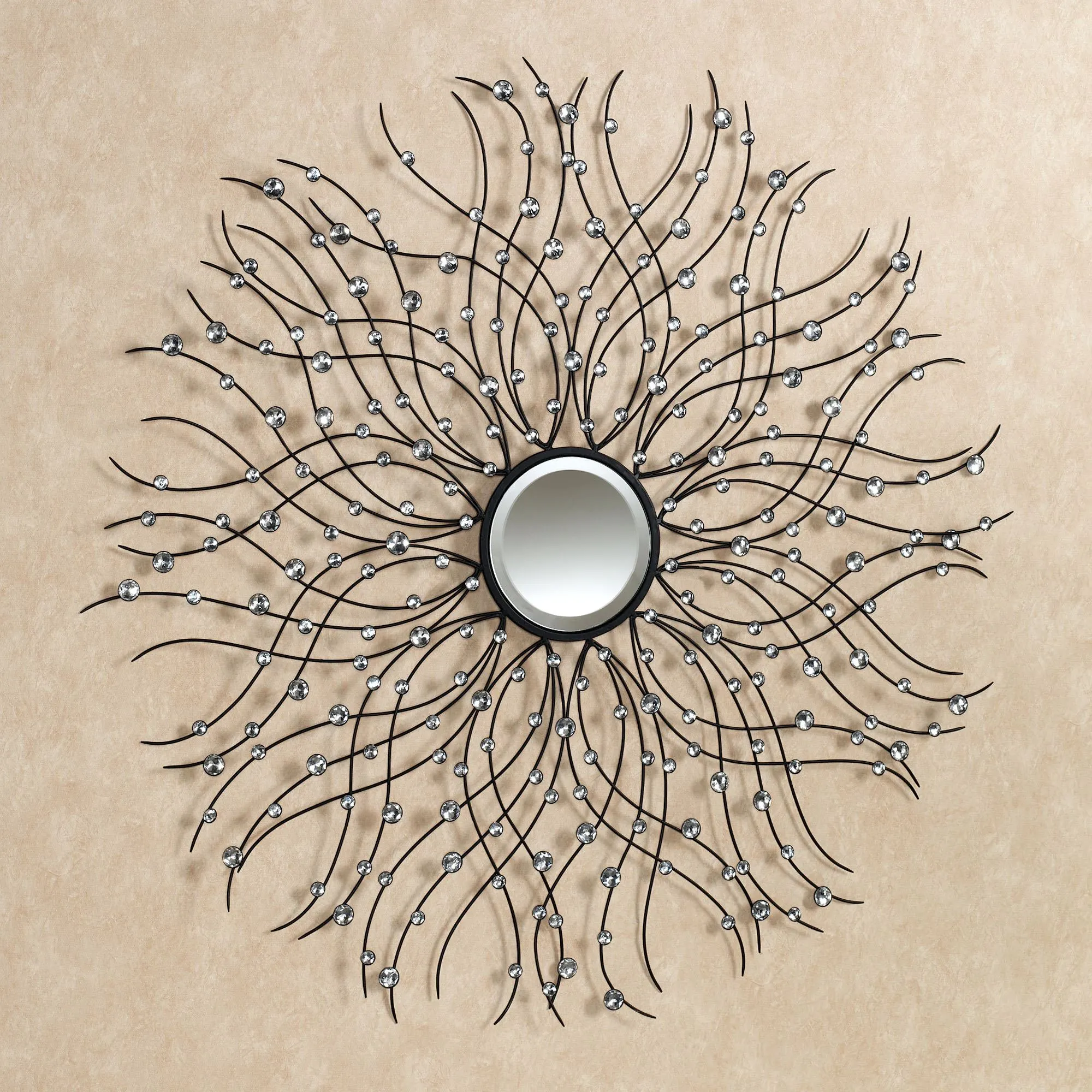 Bringing dazzling radiance to your wall, this metal wall sculpture is festooned with Jewel Drops of glittering light. A central, beveled mirror, 6.5" dia., is surrounded by an openwork, black-finished, metal frame. Crisscrossing, wavy rays radiate from the mirror and feature circular, clear acrylic gems. Contemporary wall sculpture measures 36" dia.