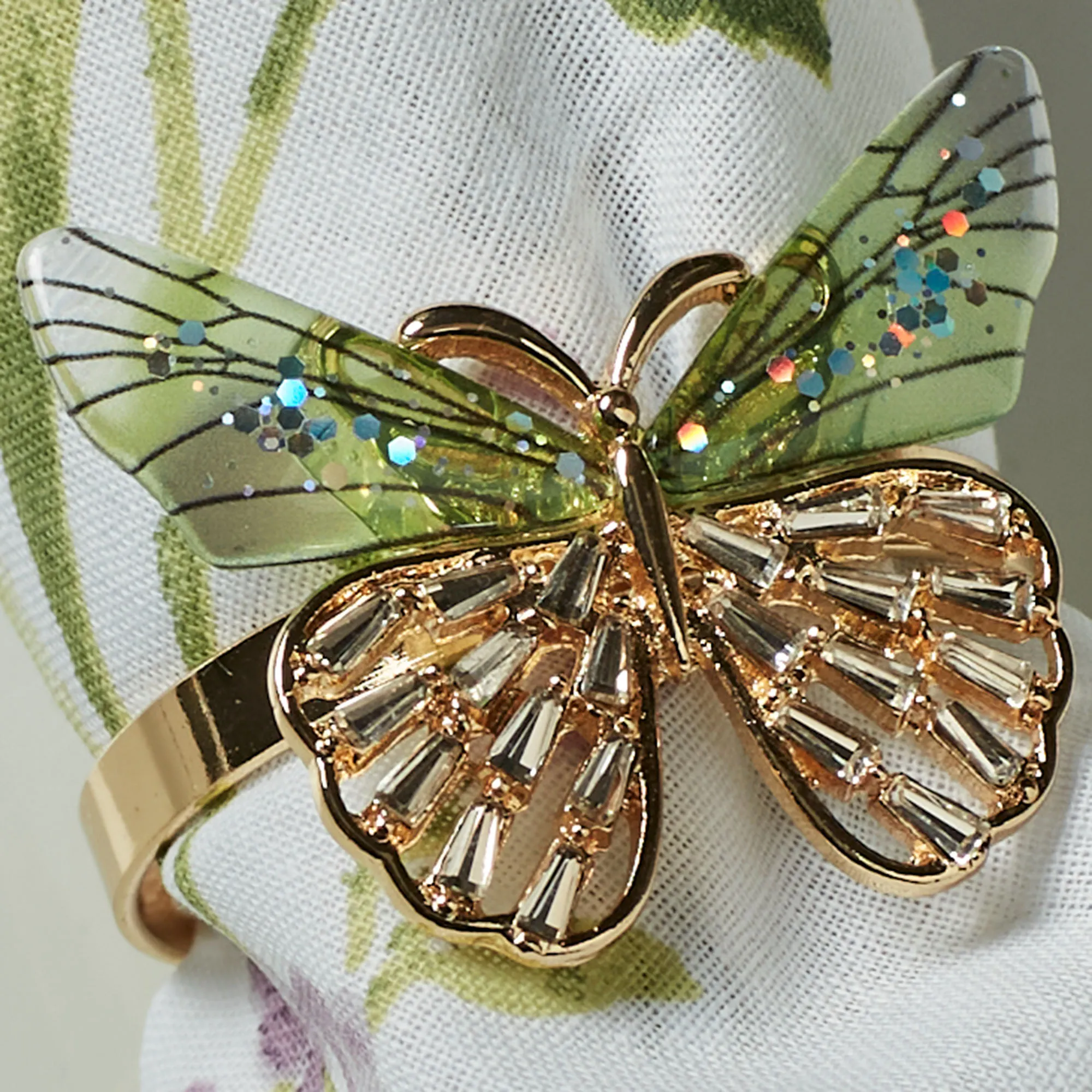 The sparkle from a Jeweled Butterfly's wings adds the perfect finishing touch to your dining tablescape. Finished in a glossy gold, the metal napkin rings in this set feature a beautiful butterfly with dual-toned wings. Green glittered molded polymer adorns the top of the wings, while clear faux jewels sparkle from the openwork bottom section. Each nature-inspired dining accent has a 1.5" dia. ring and measures 2"Wx2"Dx1.5"H.