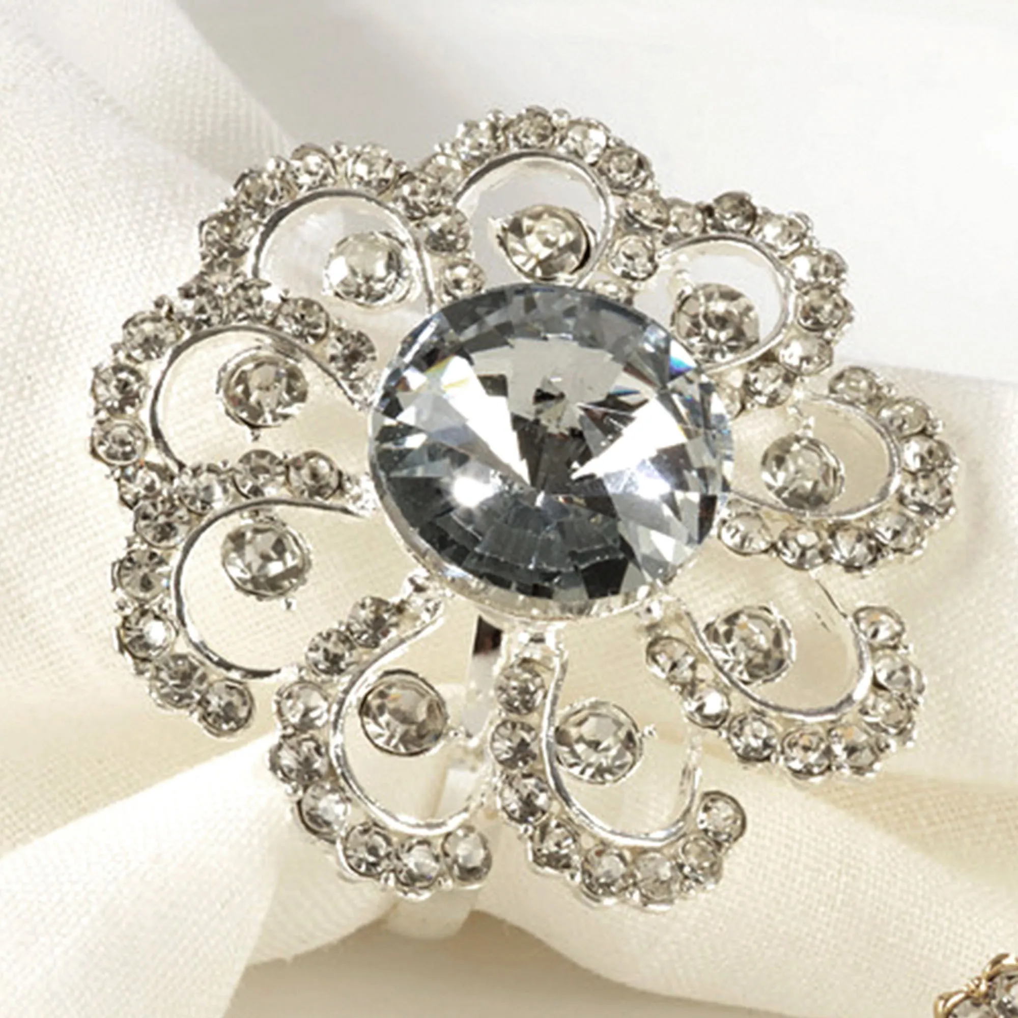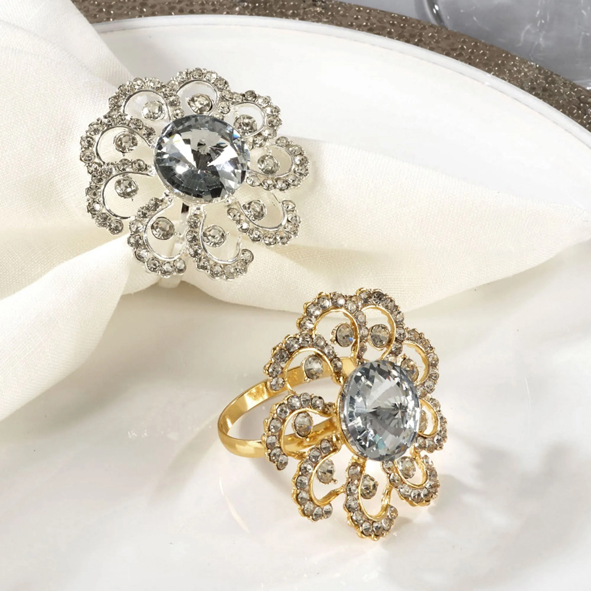 Sparkling with Jeweled Elegance, this napkin ring set adds a glint of glamour to any table setting. The ornate metal napkin rings, 1.5" dia., feature an acrylic diamond in the center of an openwork medallion with jewel accents. Overall, each is 2.5" dia.