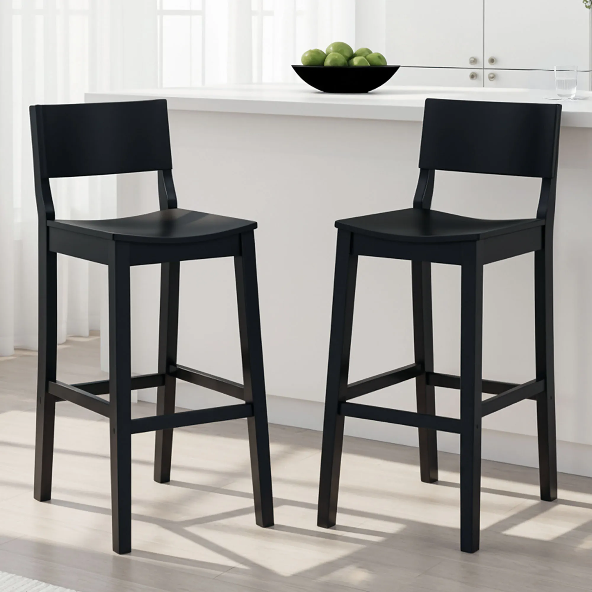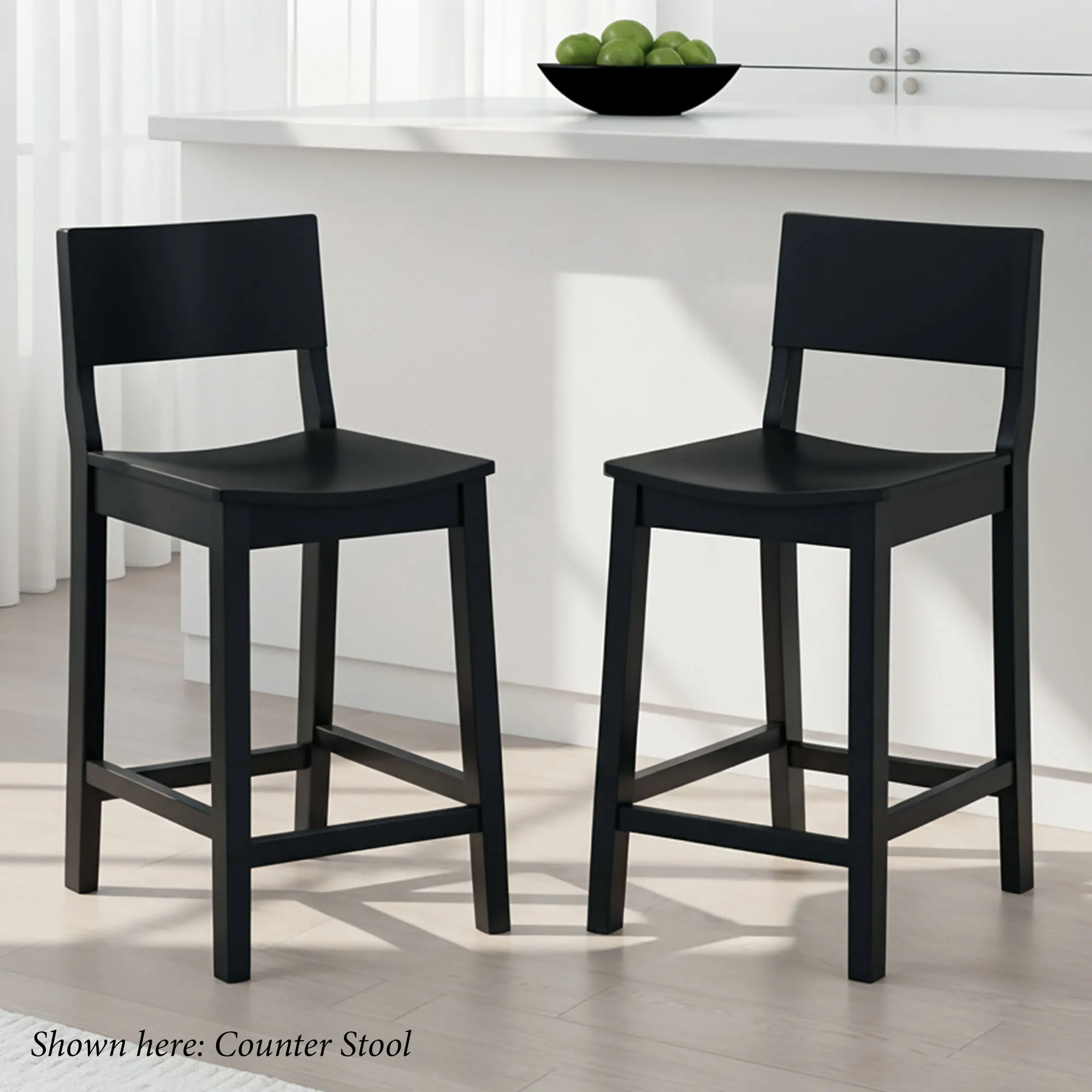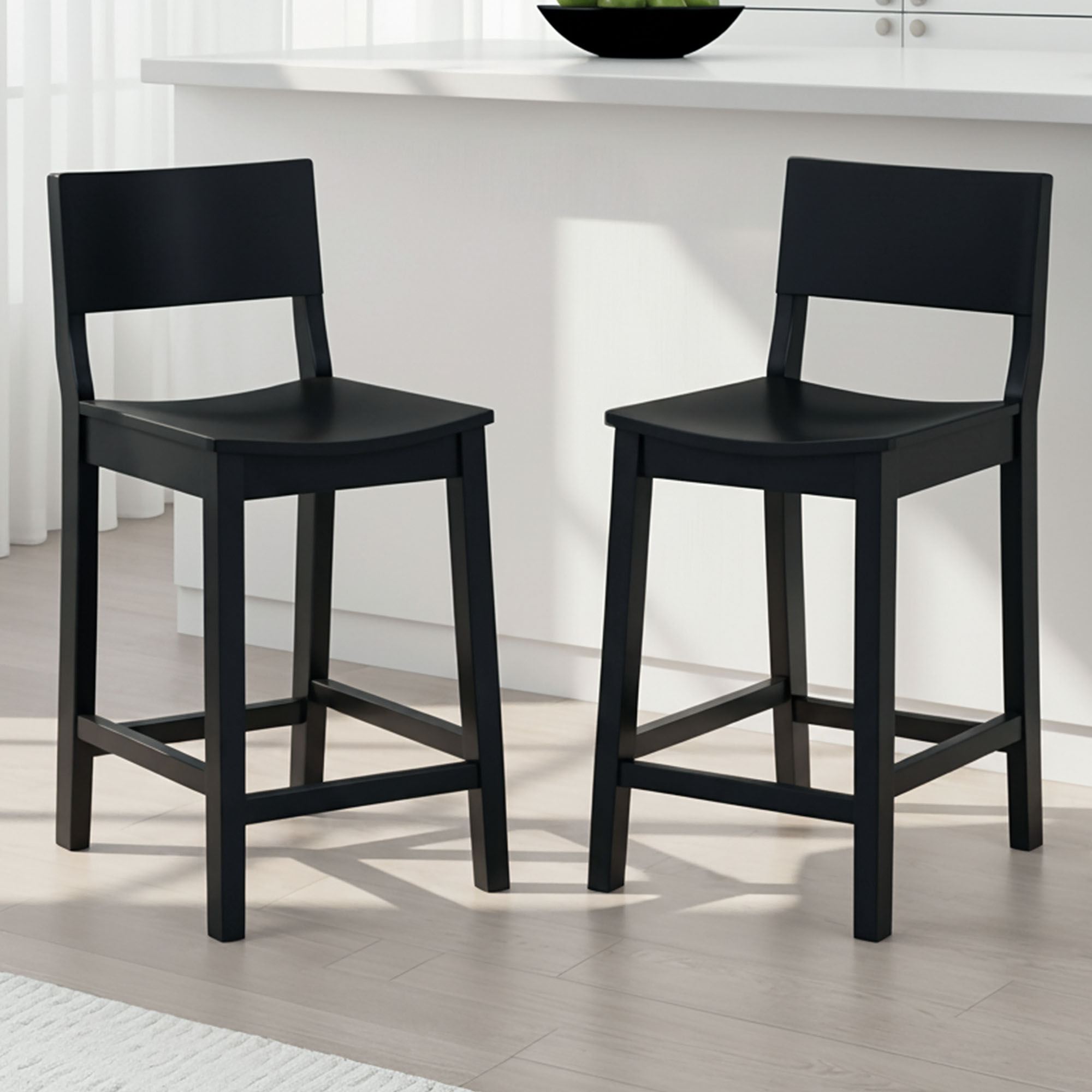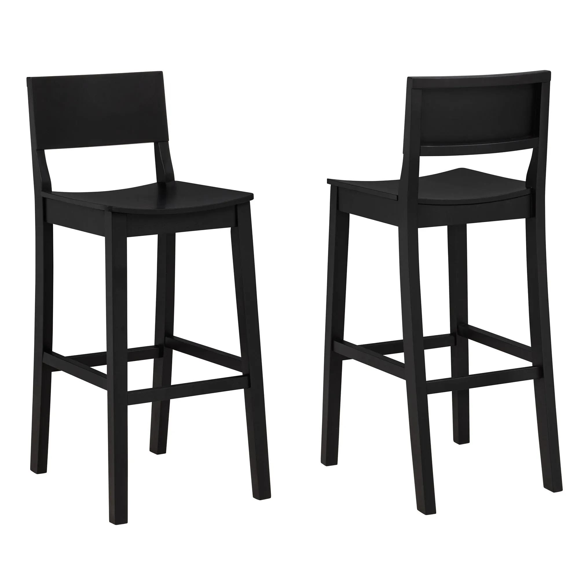 The Johannes Stool Set has a contemporary style. Finished in matte black, the rubberwood stools feature a curved seat, supportive footrests, and a solid wood frame with reinforced joints, crossbars, and a lacquer coating. Bar Stools are perfect for islands, pub tables, or counters ranging in height from 41"H to 43"H. The bar stool seat height is 30.5". Each bar stool is 17"Wx21"Dx41.5"H and weighs 17 lbs. Counter Stools are perfect for islands, pub tables, or counters ranging in height from 35"H to 39"H. The counter stool seat height is 24". Each counter stool is 16"Wx20"Dx36"H and weighs 15 lbs. The maximum recommended weight on each stool is 350 lbs.