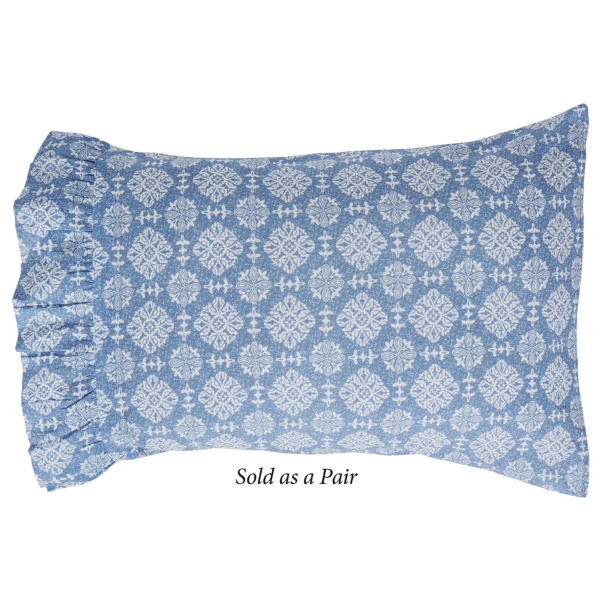 Pillowcase Pair has ivory medallions on blue cotton with 4" ruffled hems. Specify Standard/Queen Pair or King Pair.